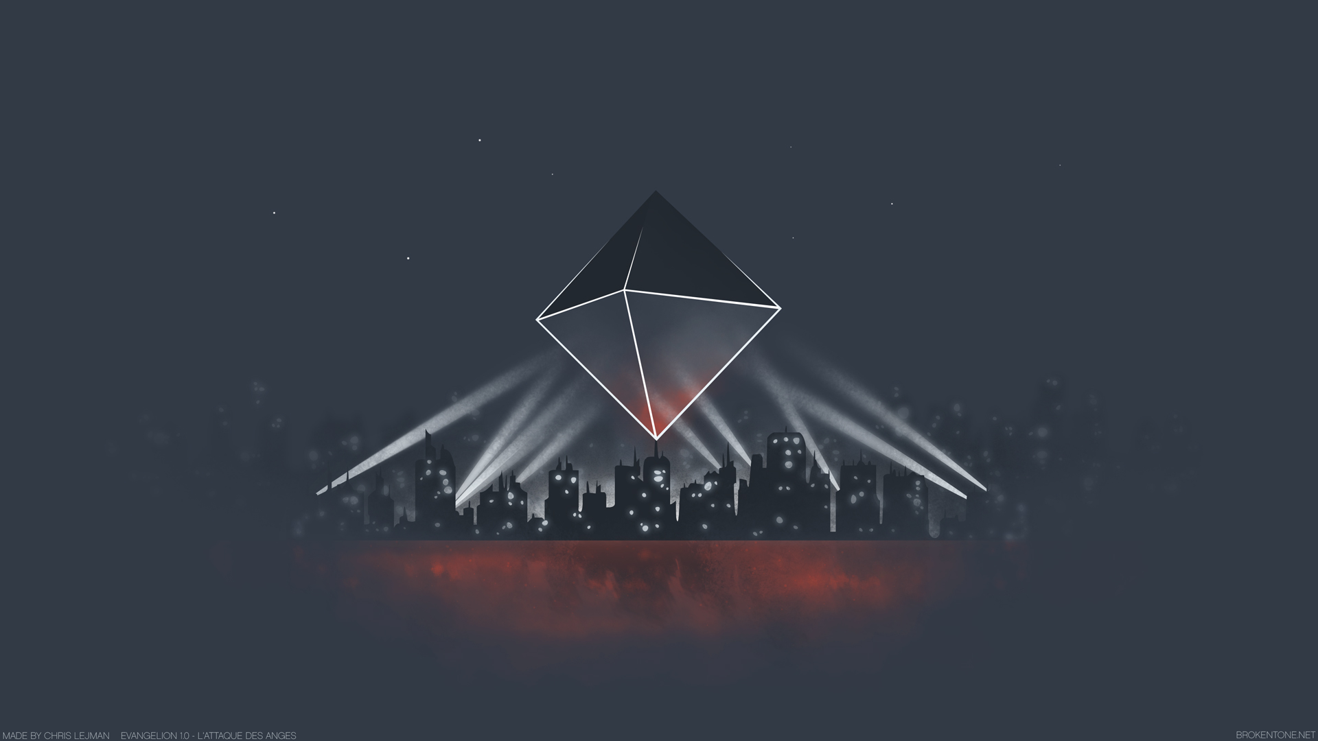 Description: A picture of a city with a kite in the sky and lights coming out of it and a red light coming from the bottom of the kite.