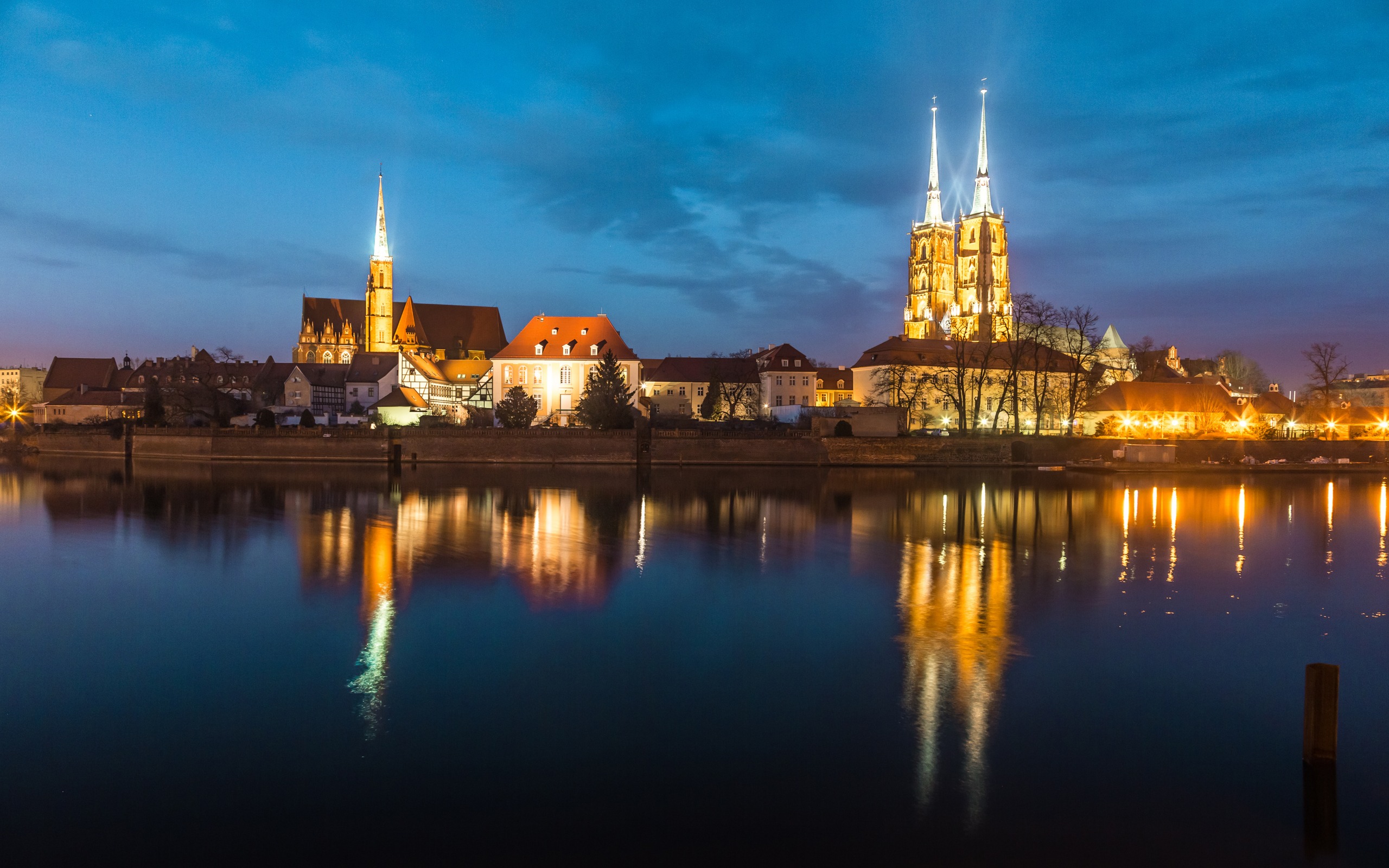 Description: A city with a lake and a church lit up at night with lights reflecting in the water and a few buildings.