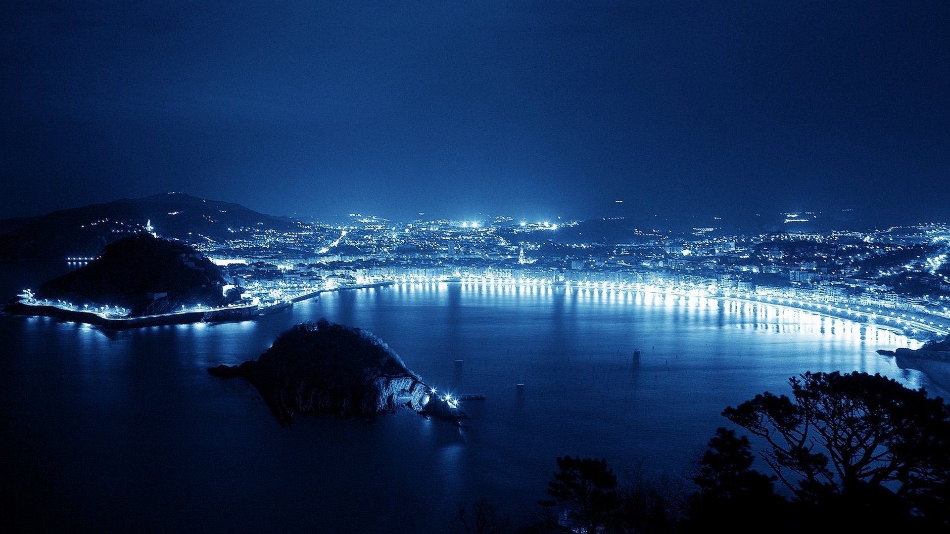 Description: A city lit up at night with a lake and mountains in the background and a city lit up at night.