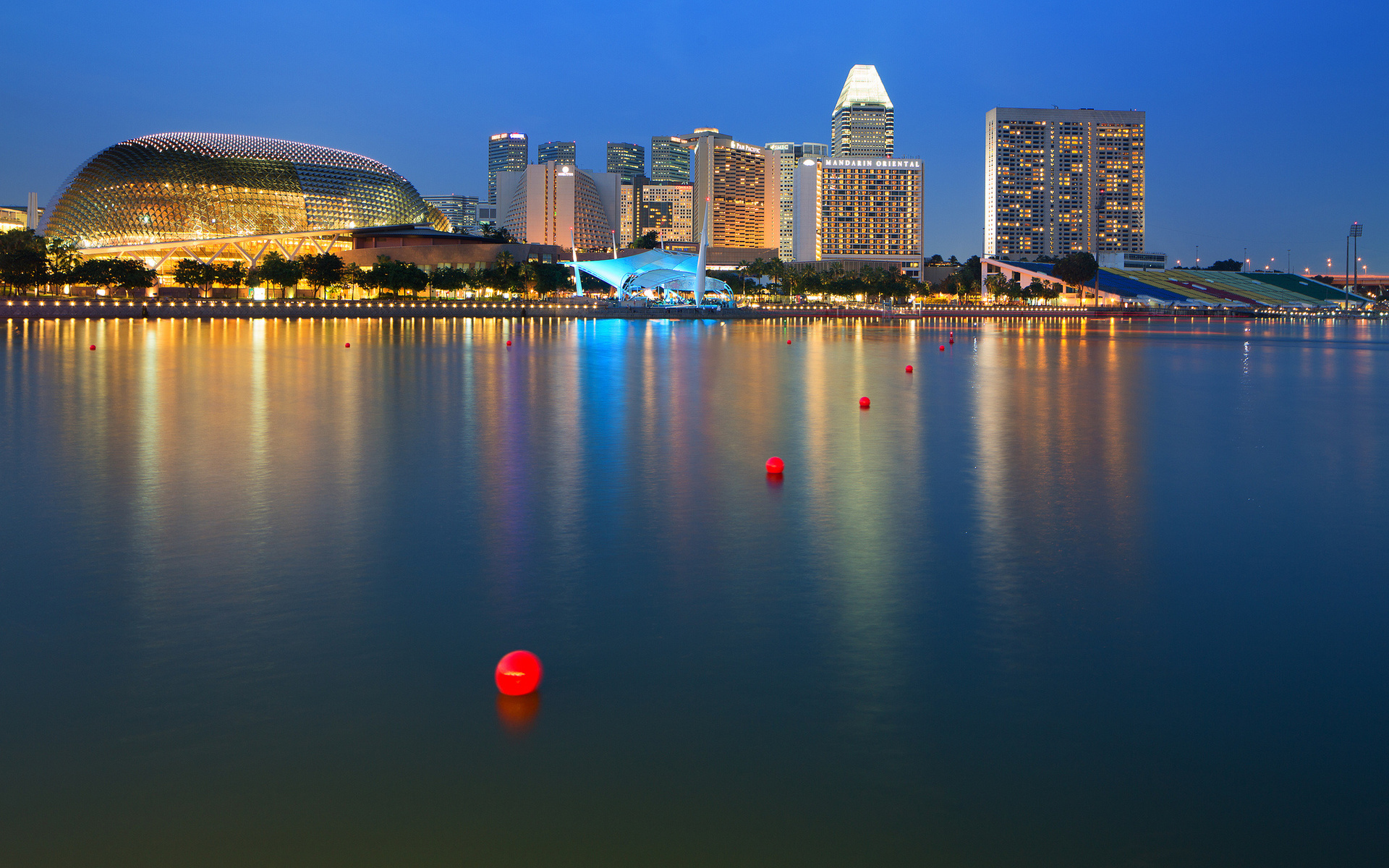 Description: A city skyline with a lake and a lot of lights in the water at night time with a bright blue sky.