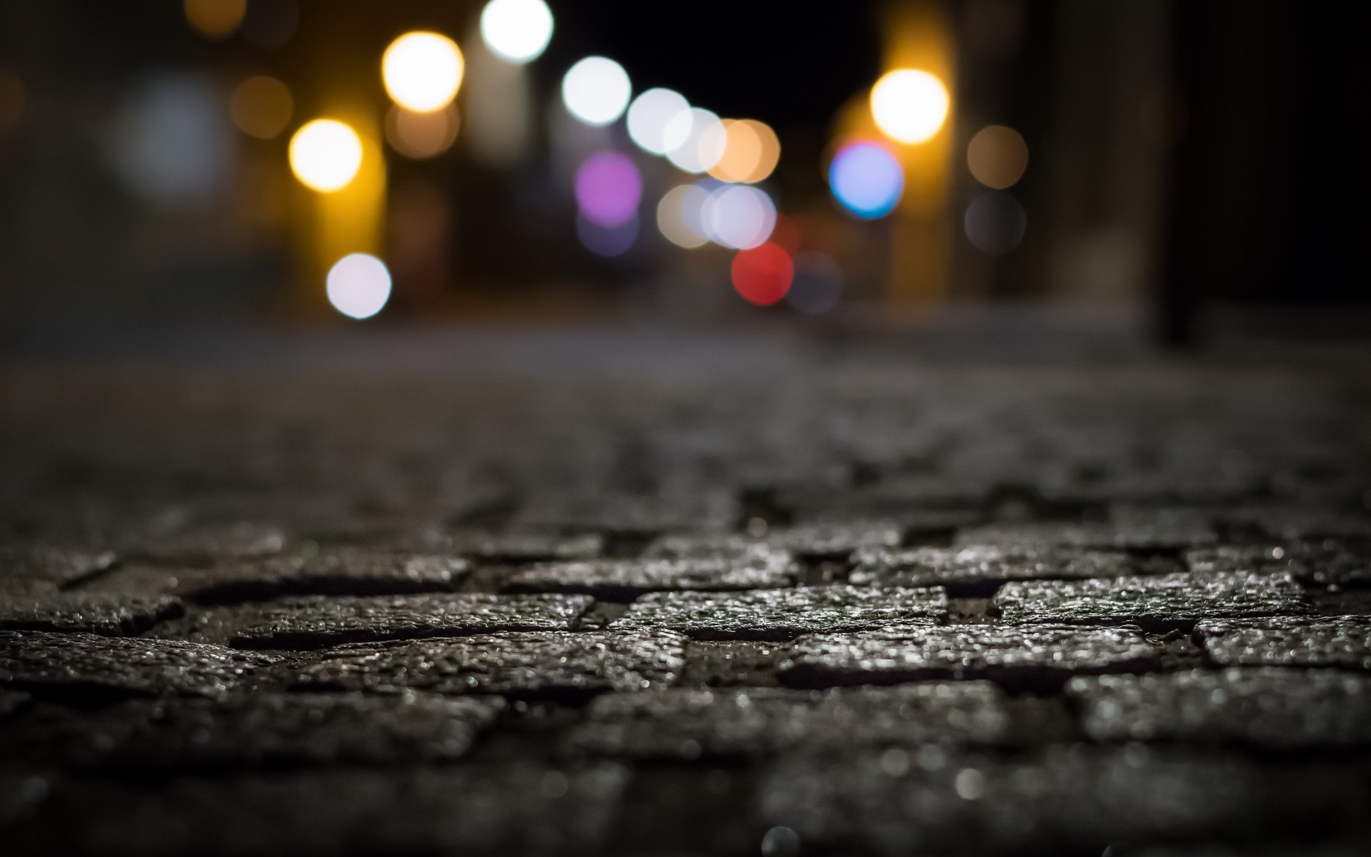 Description: A street with a lot of lights in the background and a sidewalk with a lot of pavement stones on it.