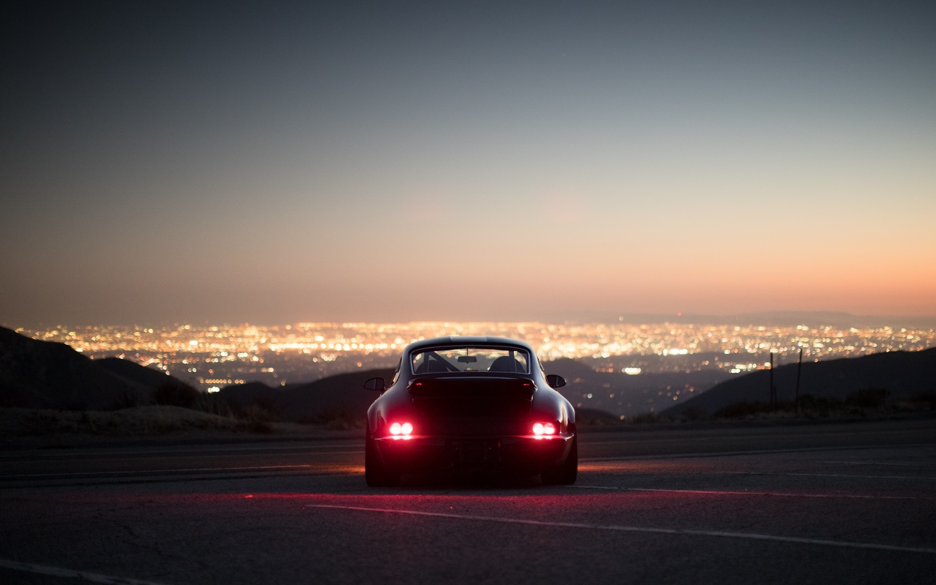 Description: A car driving down a road with a city in the background at night time with lights on the headlights.