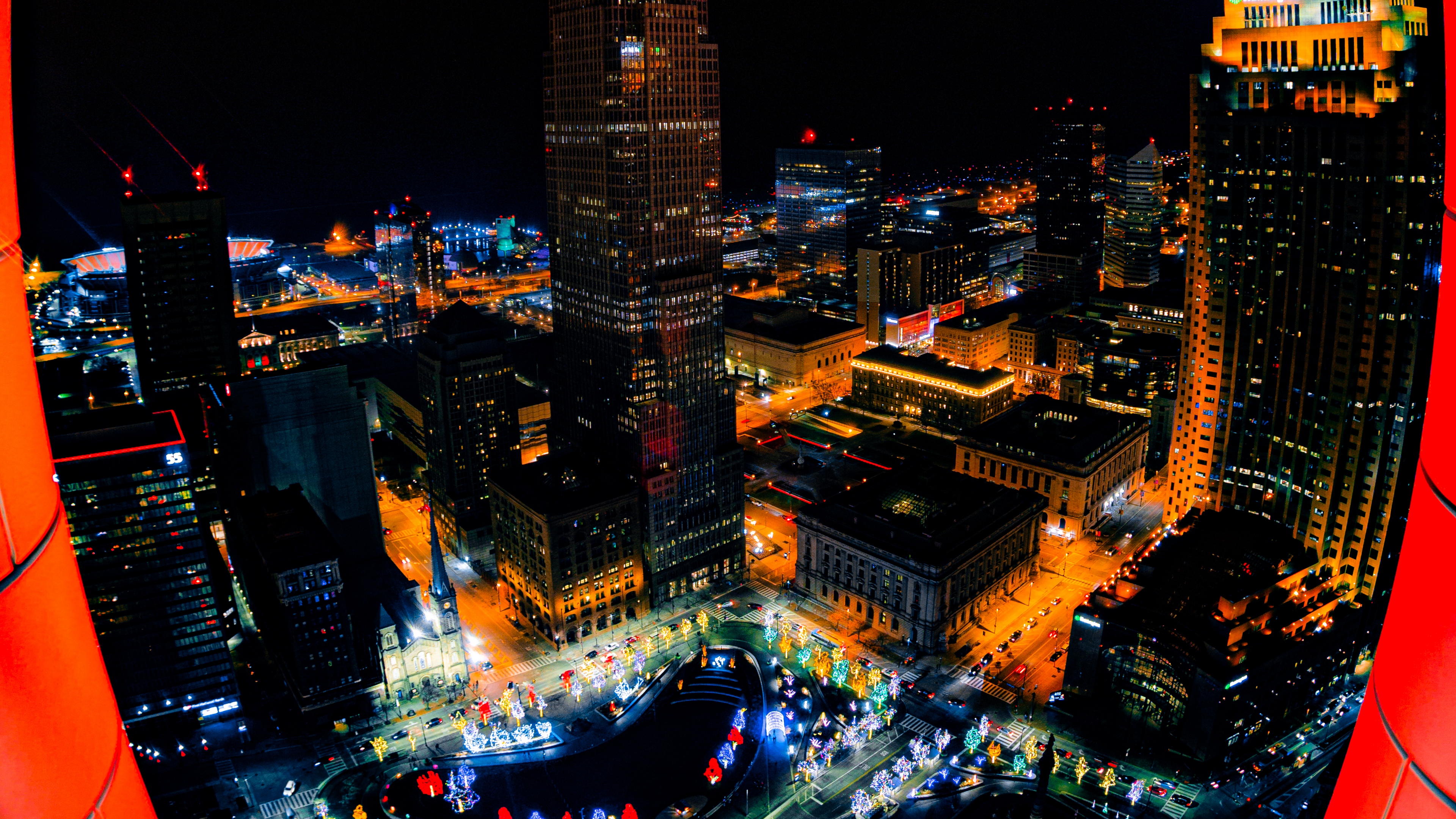 Description: A city at night with a lot of lights and buildings lit up in the dark and bright colors of the lights.