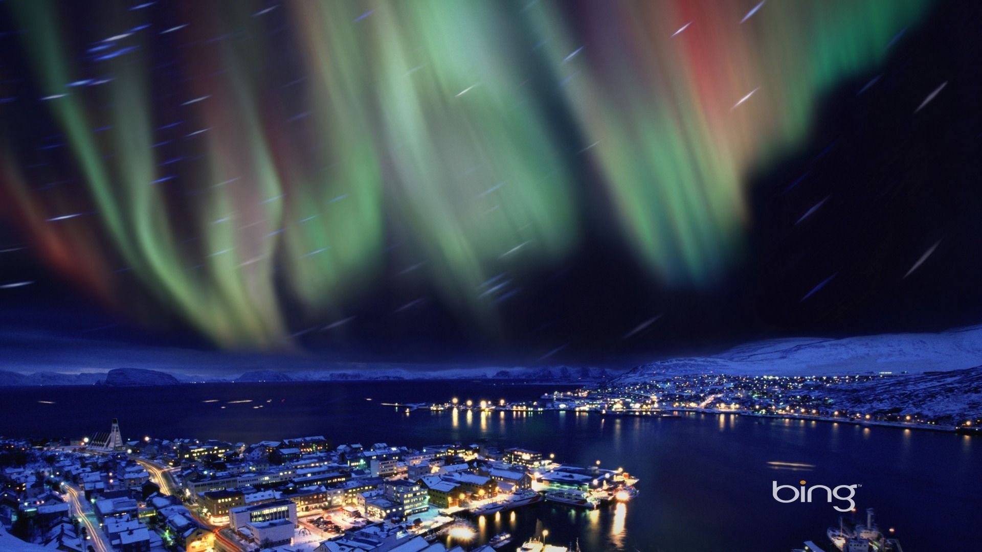 Description: A city with a lot of lights in the sky and a lot of snow on the ground and a lot of snow on the ground.