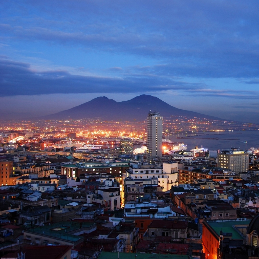 Description: A city with a mountain in the background at night time with lights on and buildings lit up in the foreground.