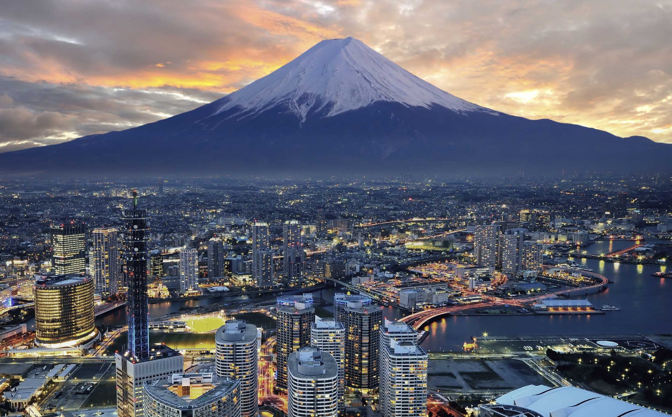 Description: A city with a mountain in the background at night time with a sunset in the foreground and a river running through it.
