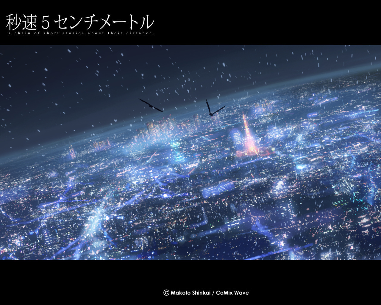 Description: A picture of a city at night with a bird flying over it and a bird flying over the city.