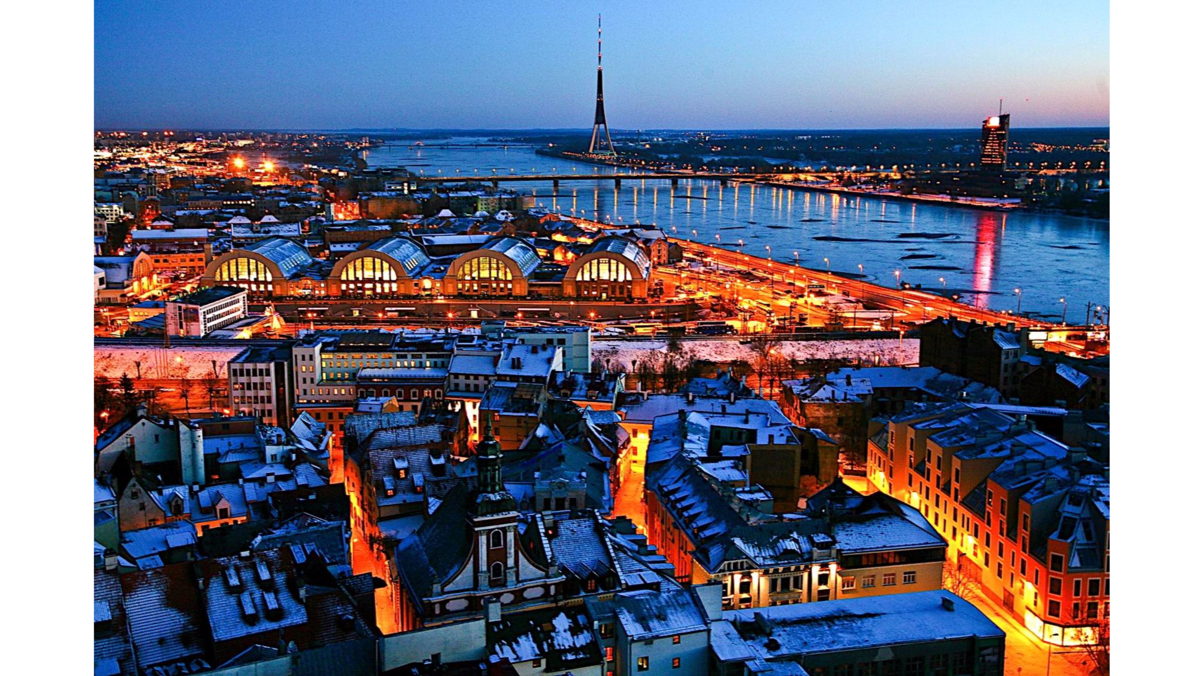 Description: A city with a lot of buildings and lights on it at night time with a bridge in the background.