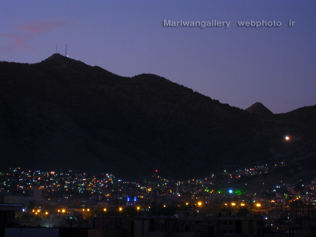 Description: A city at night with a mountain in the background and a full moon in the sky above it.