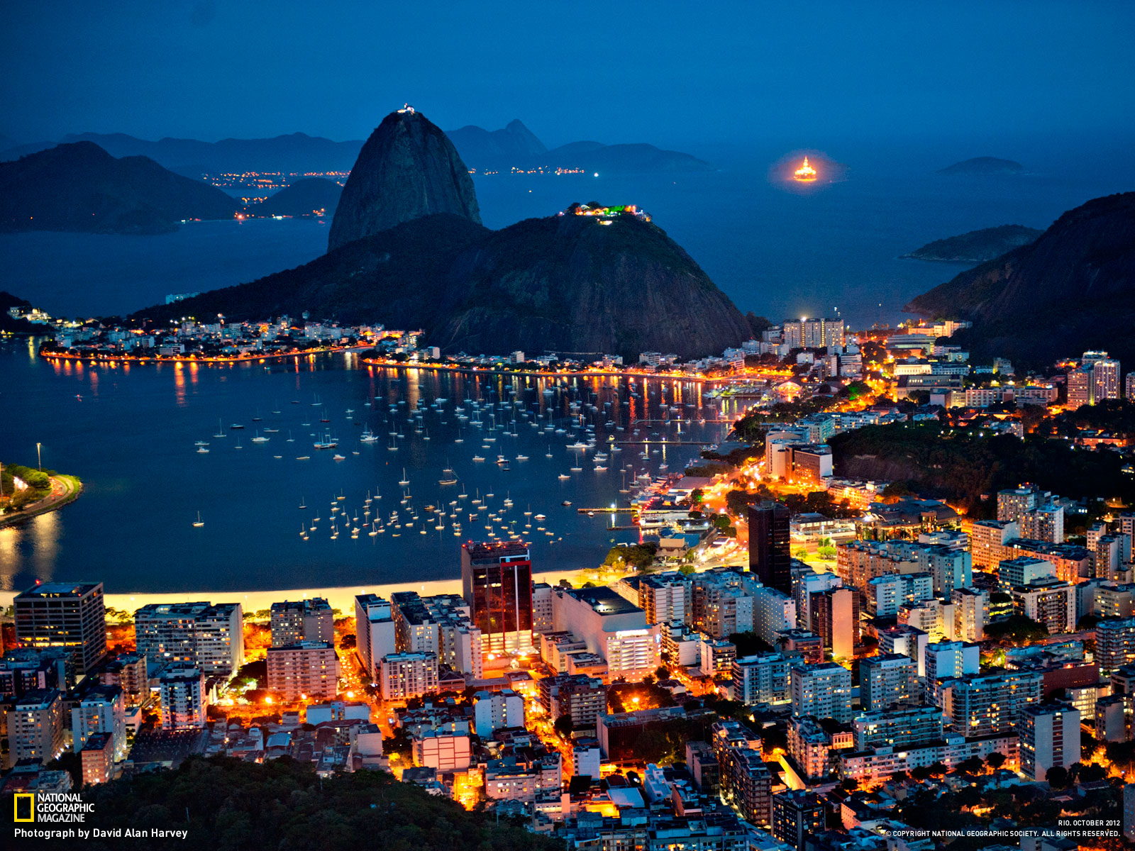 Description: A city at night with a mountain in the background and a body of water in the foreground with boats in the water.
