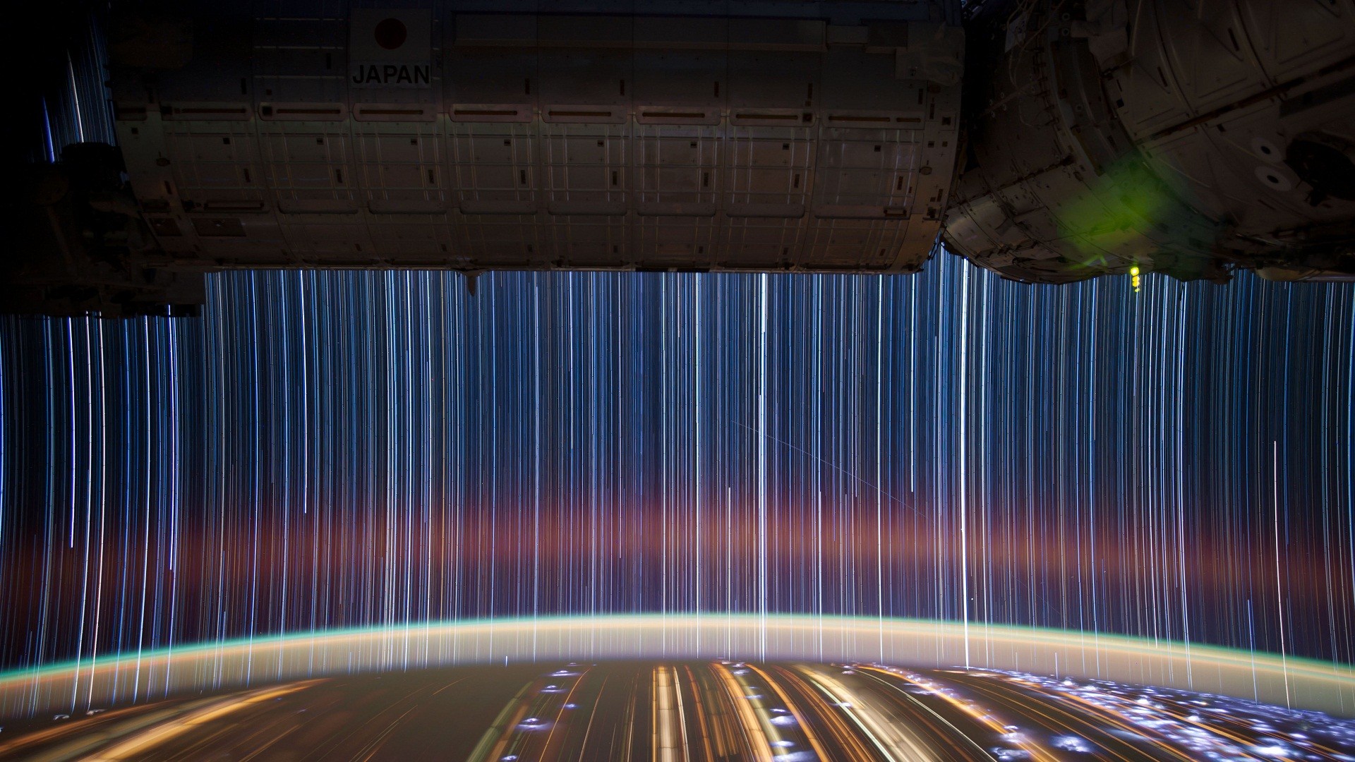 Description: A view of a city from space at night time with stars and lines in the sky above the earth.