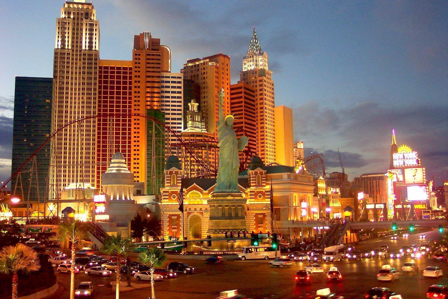 Description: A city with a lot of tall buildings and cars driving down the street at night time with a lot of lights on.
