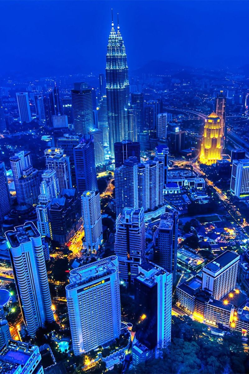 Description: A city at night with a lot of tall buildings and lights on it's sides and a blue sky.