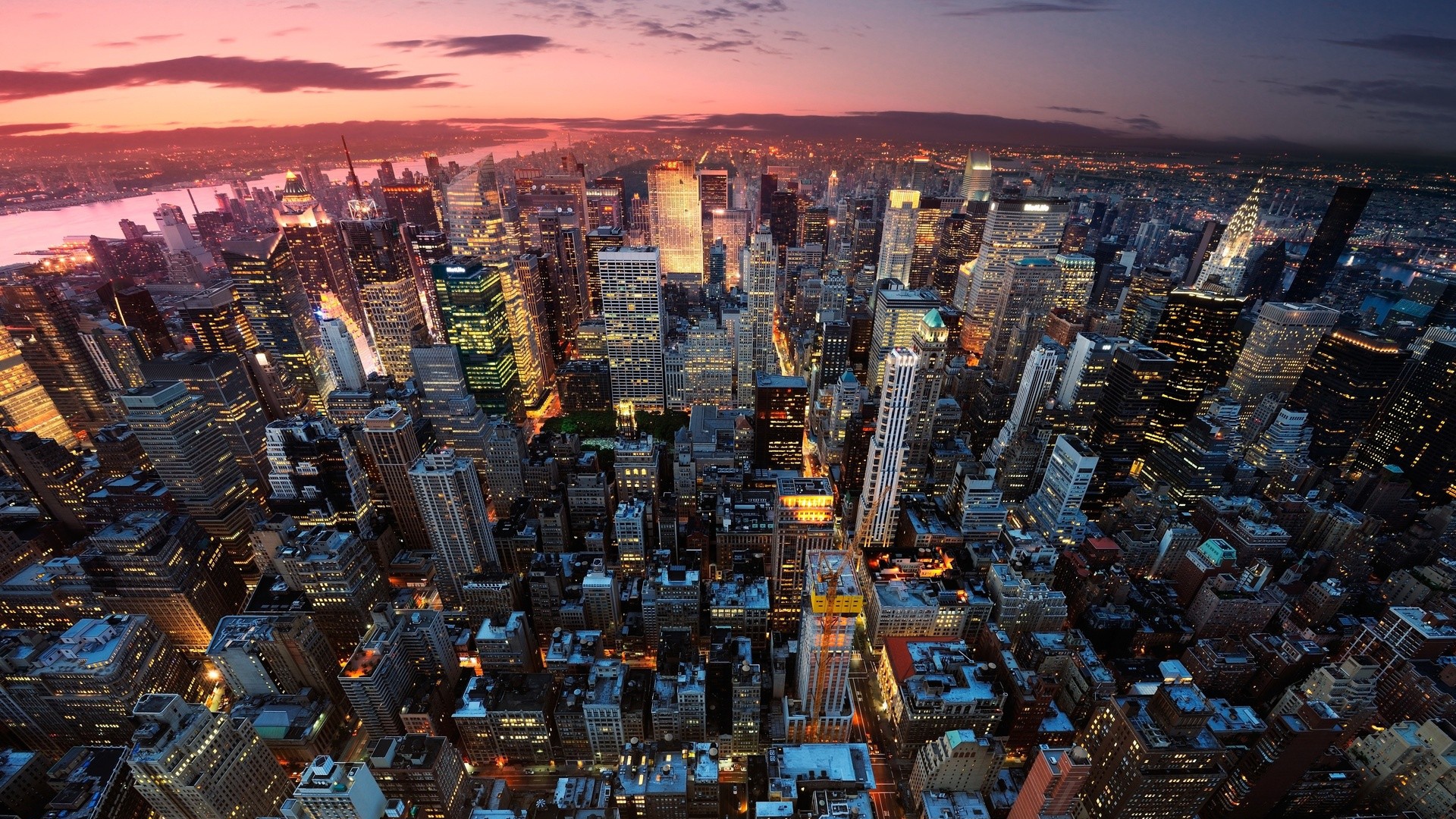 Description: A city at night with a lot of tall buildings and lights on it's sides and a body of water in the distance.
