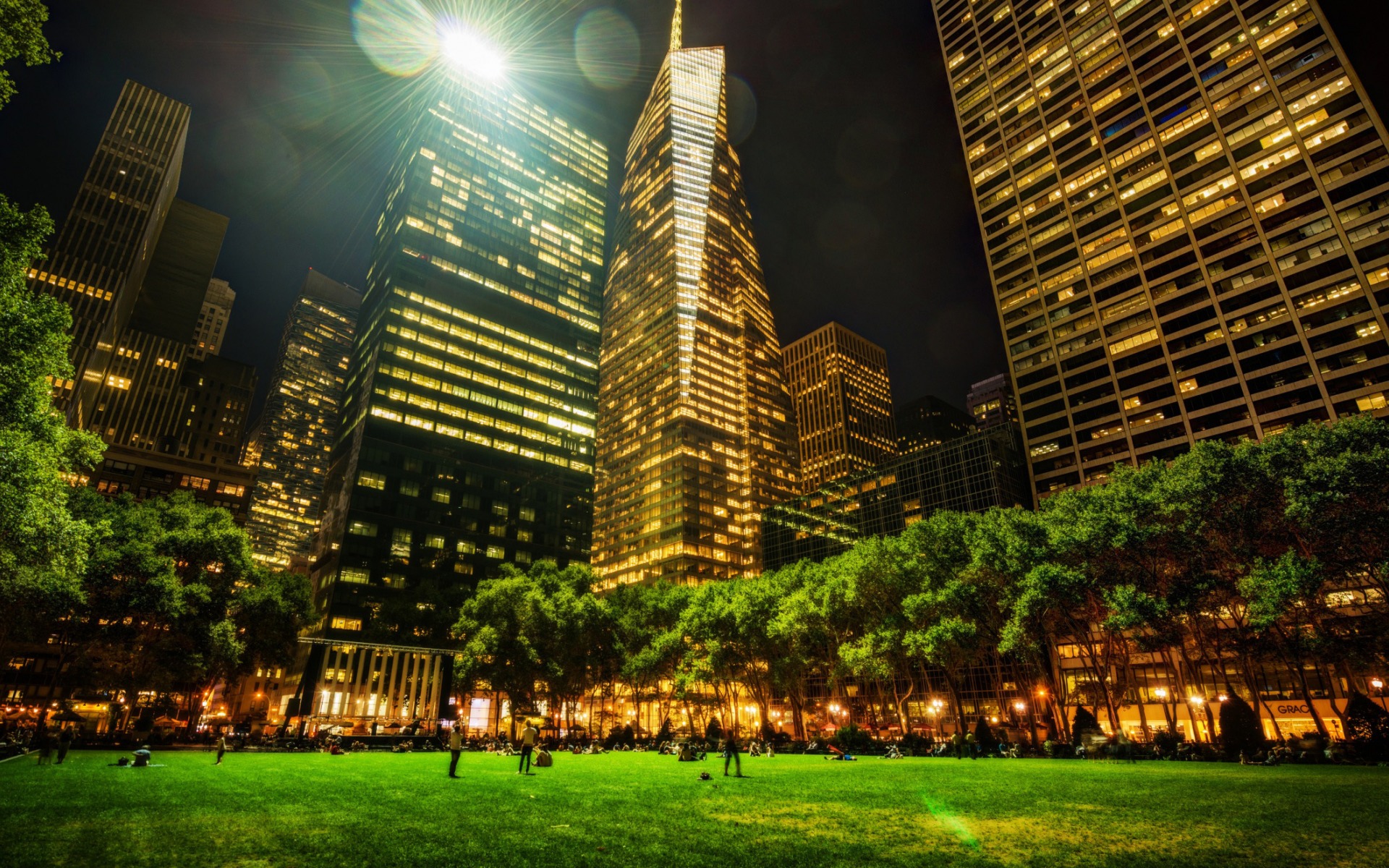 Description: A city at night with a lot of tall buildings and people walking around it and a green field in front of it.