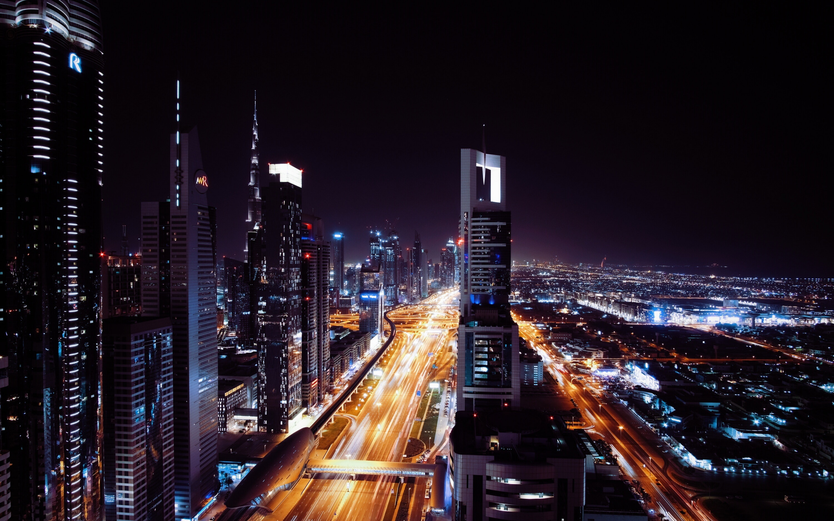 Description: A city at night with a lot of traffic and tall buildings in the background and a lot of lights on the street.