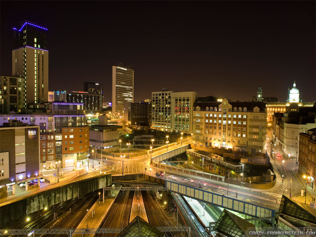 Description: A city at night with a train on the tracks and a train station in the foreground and a train on the tracks.