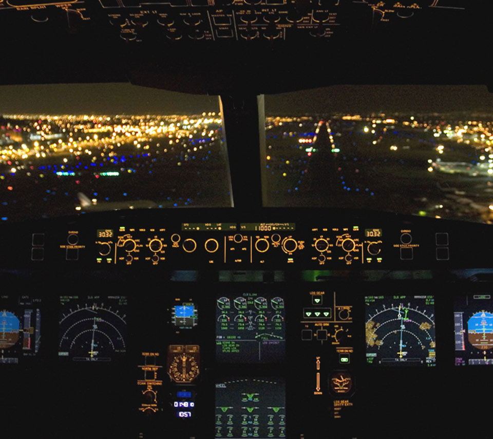 Description: A view of a city from a plane at night time with lights on the windows and a view of the city from the cockpit.