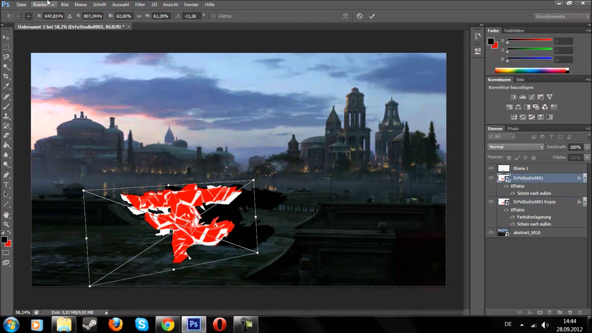 Description: A picture of a city with a red flower on it's face and a black background with a red flower on it's face.