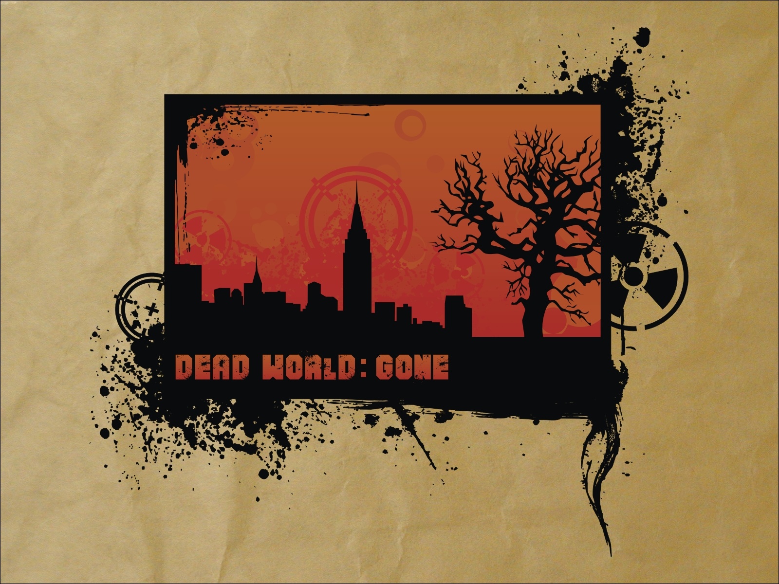 Description: A picture of a city with a red sky in the background and a black and white picture of a tree.