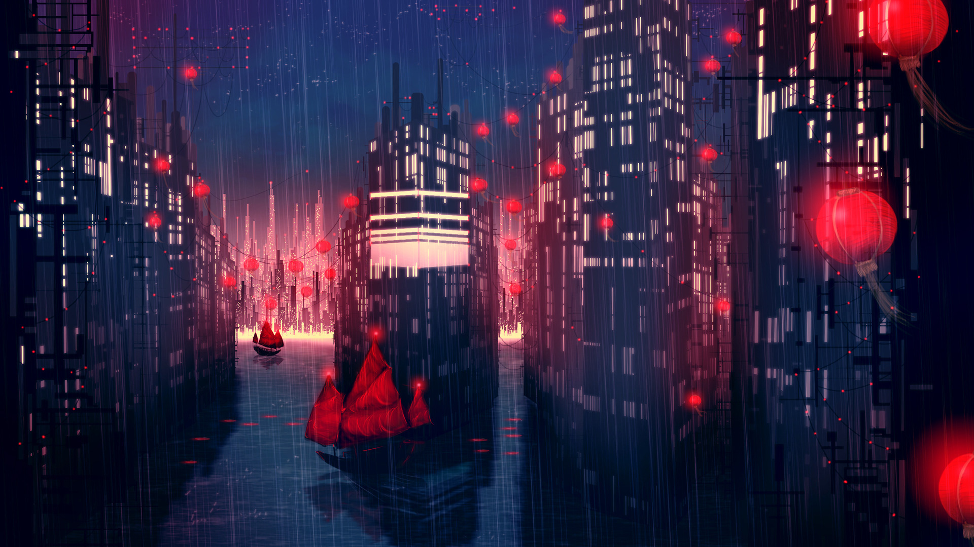 Description: A city with a red umbrella and a red boat in the water at night time with red lights on the buildings.