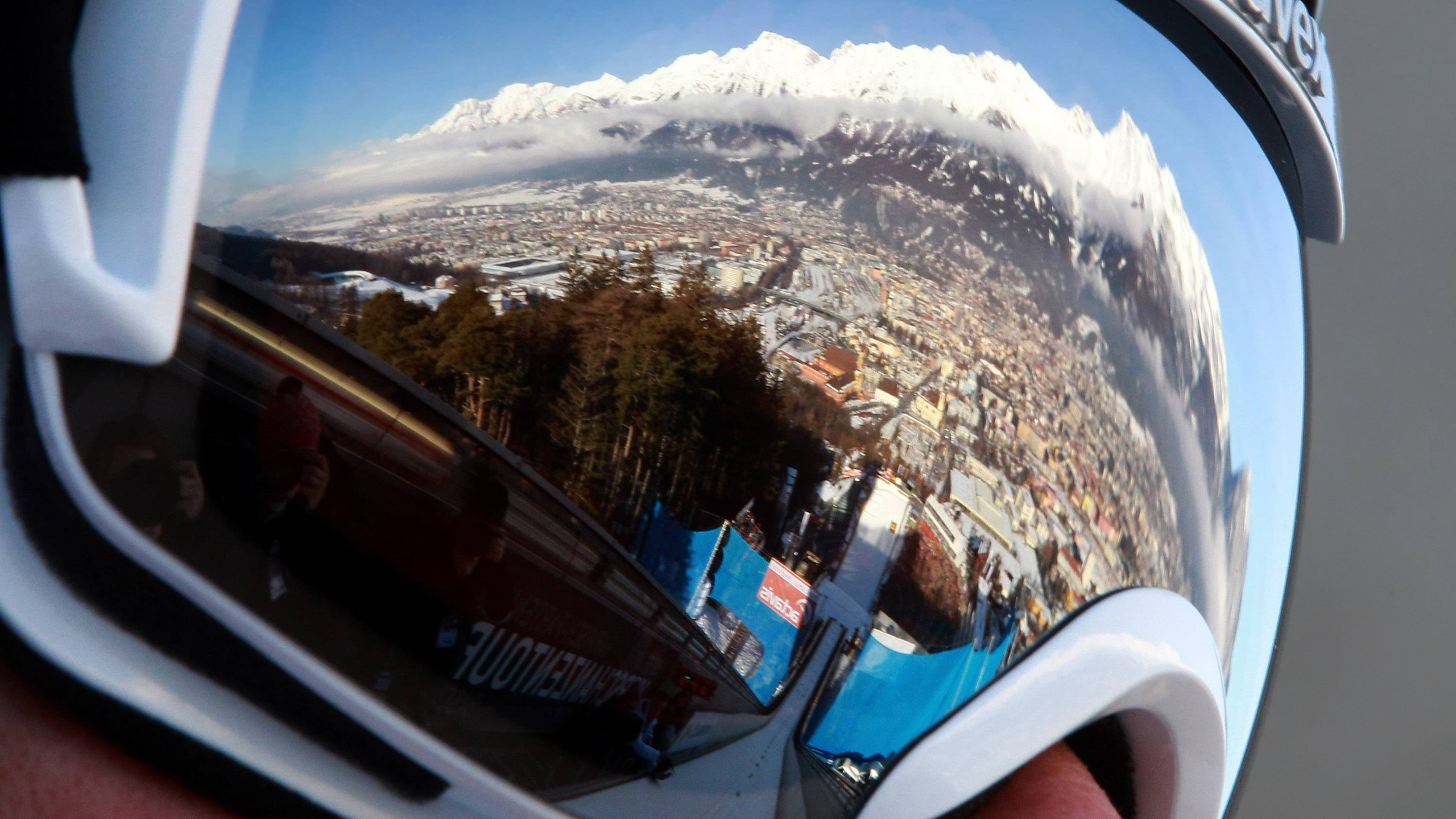 Description: A person is holding a pair of ski goggles in their hand and the reflection of a city in the goggles.