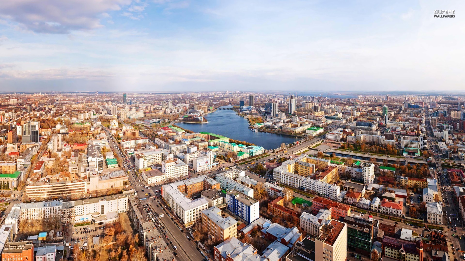 Description: A city with a river running through it and a bridge crossing over it in the middle of the city.