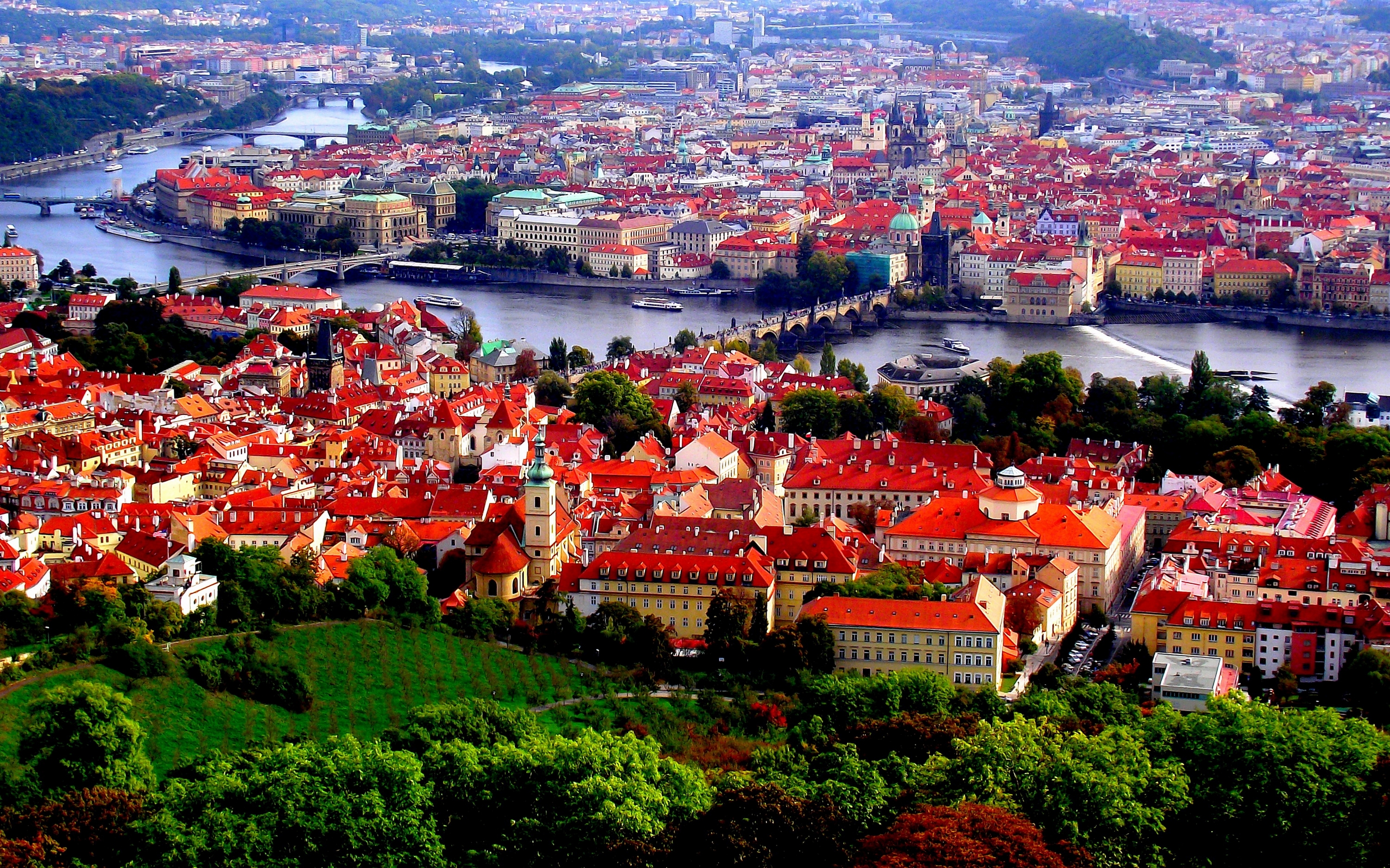Description: A city with a river and a bridge in the middle of it and lots of red roofs on the buildings.