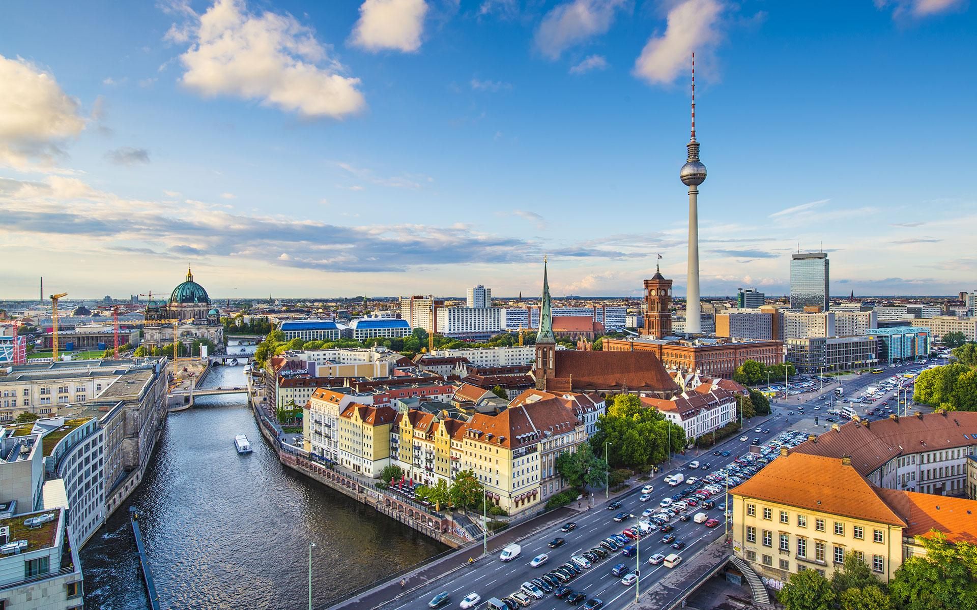 Description: A city with a river and a bridge in the middle of it and a tower in the background with a sky background.