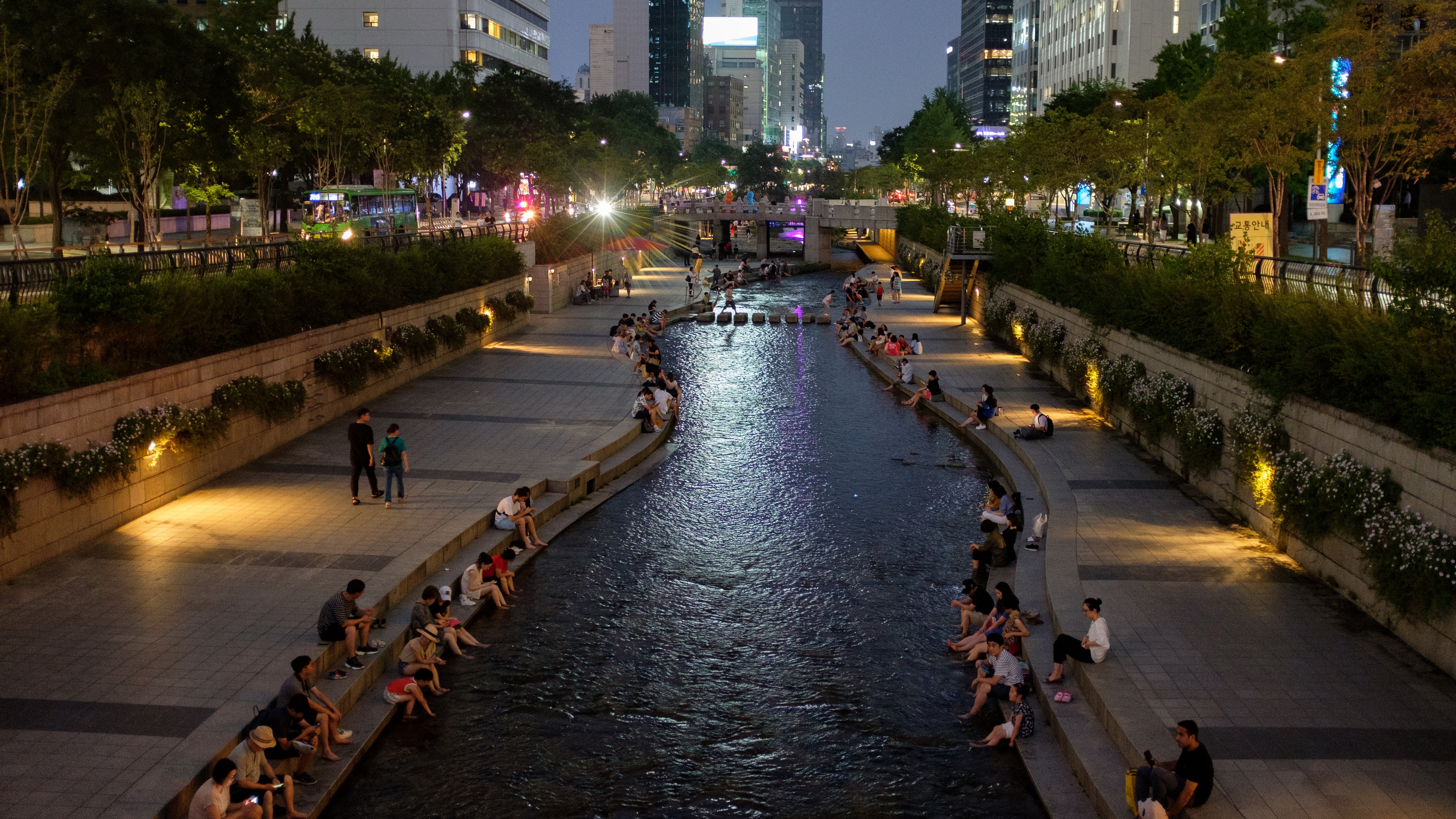 Description: A river running through a city at night with people sitting on benches and walking around it and people sitting on benches.