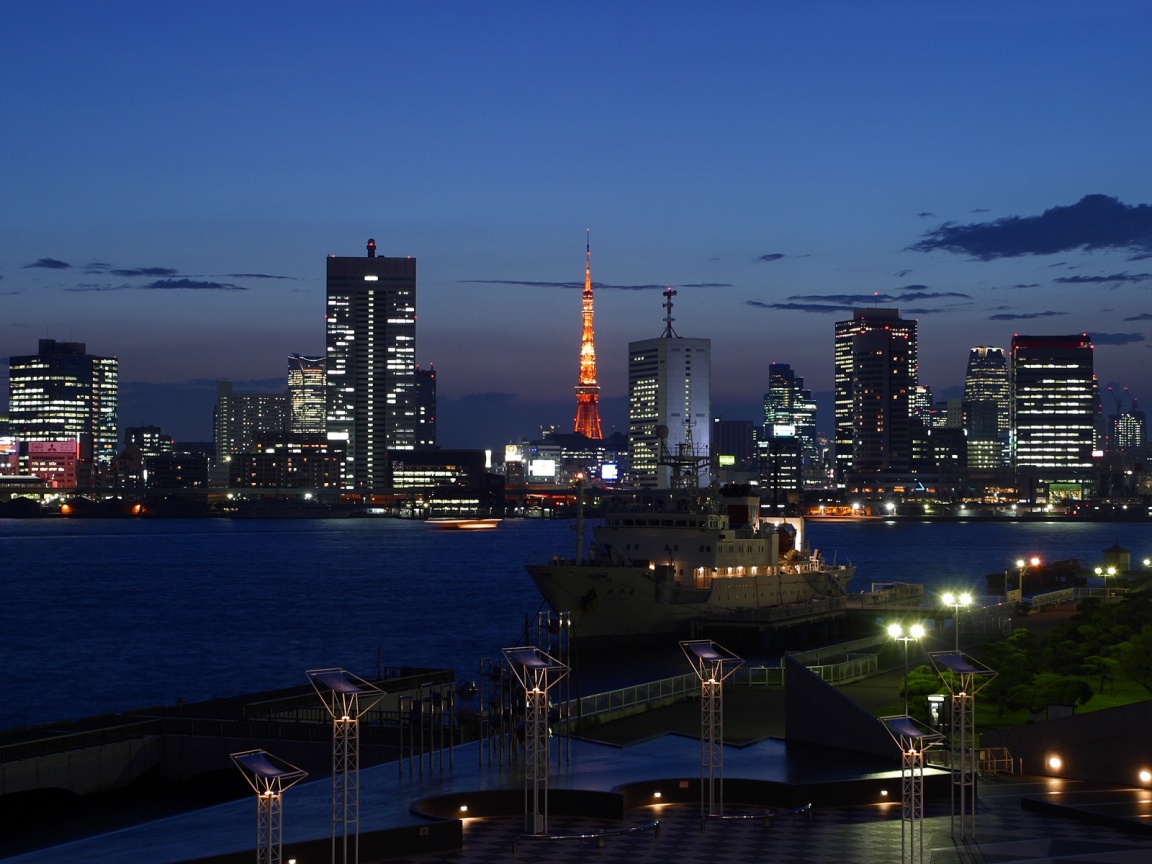 Description: A city skyline with a large boat in the water at night time with lights on the buildings and a lit up tower.