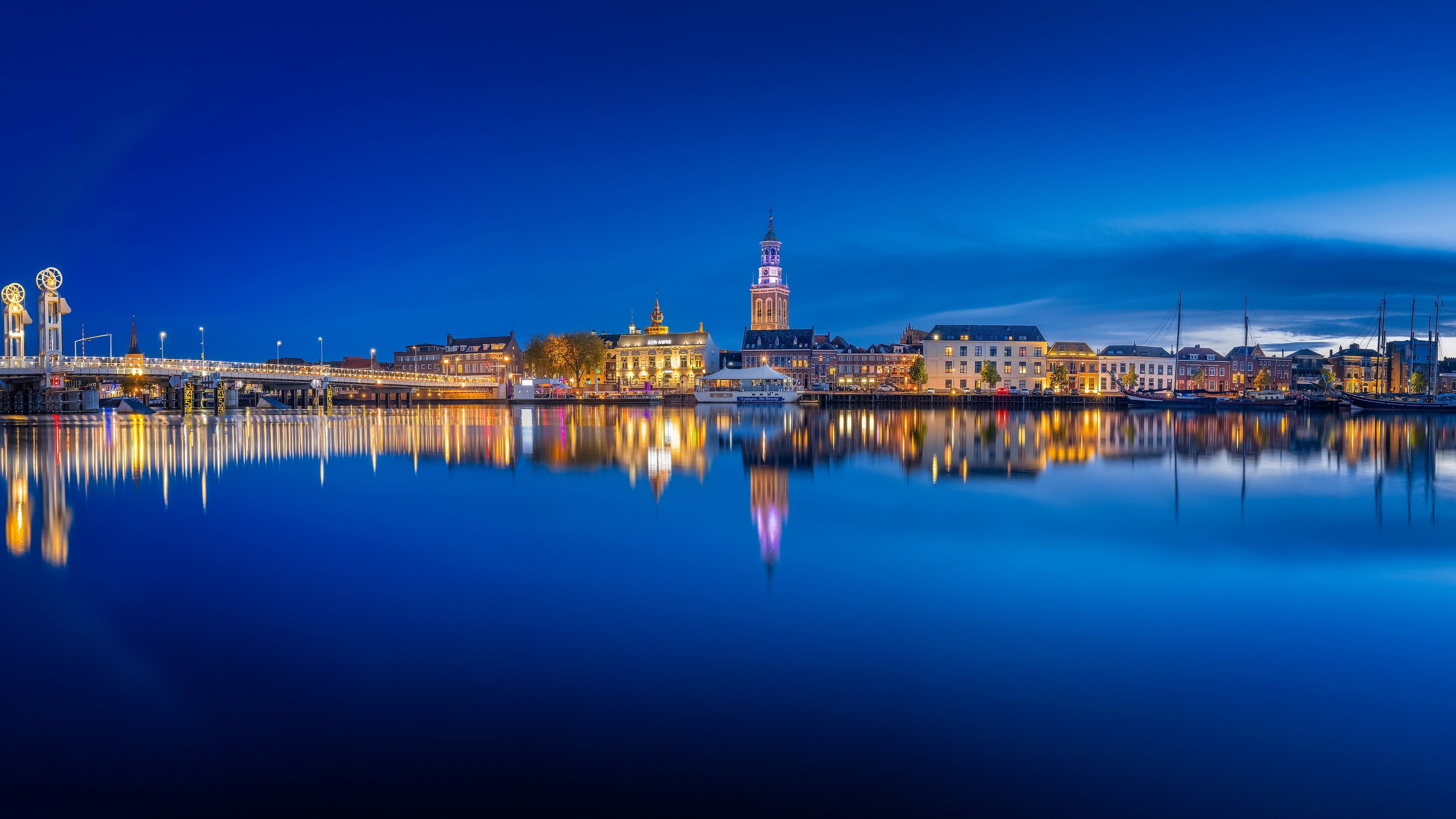 Description: A city skyline with a bridge over a body of water at night time with a lit up clock tower.
