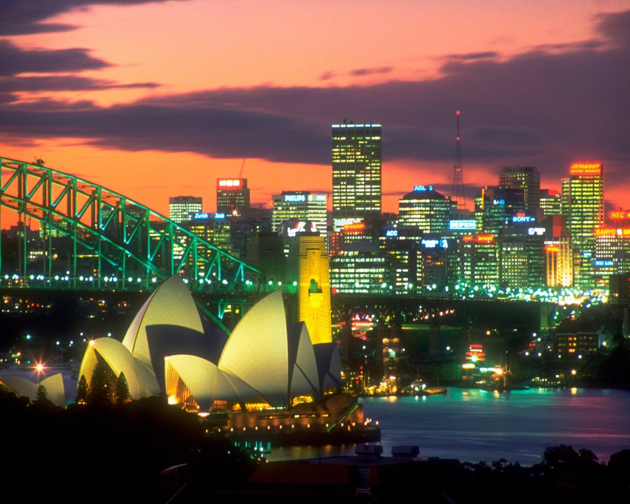 Description: A city skyline with a bridge and a large building in the foreground and a river in the foreground.