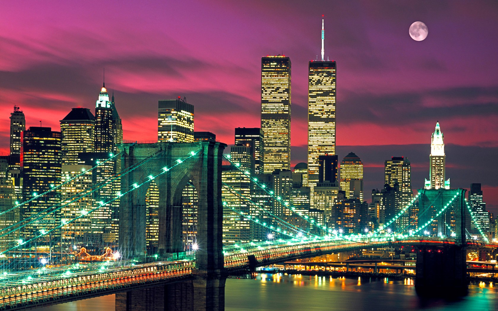 Description: A city skyline with a bridge and a full moon in the sky above it and a pink and purple sky.