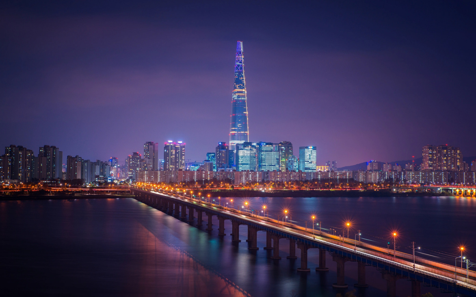 Description: A city skyline with a bridge and a large building at night time with lights on it and a bridge leading to a large building.