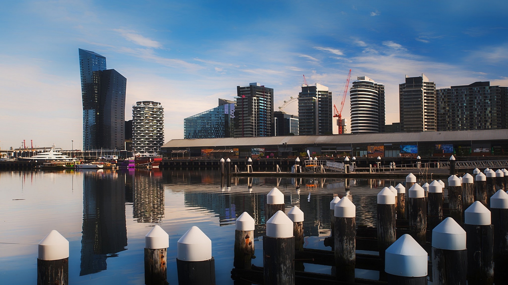 Description: A city skyline with a body of water and a bridge in the foreground and a few buildings in the background.