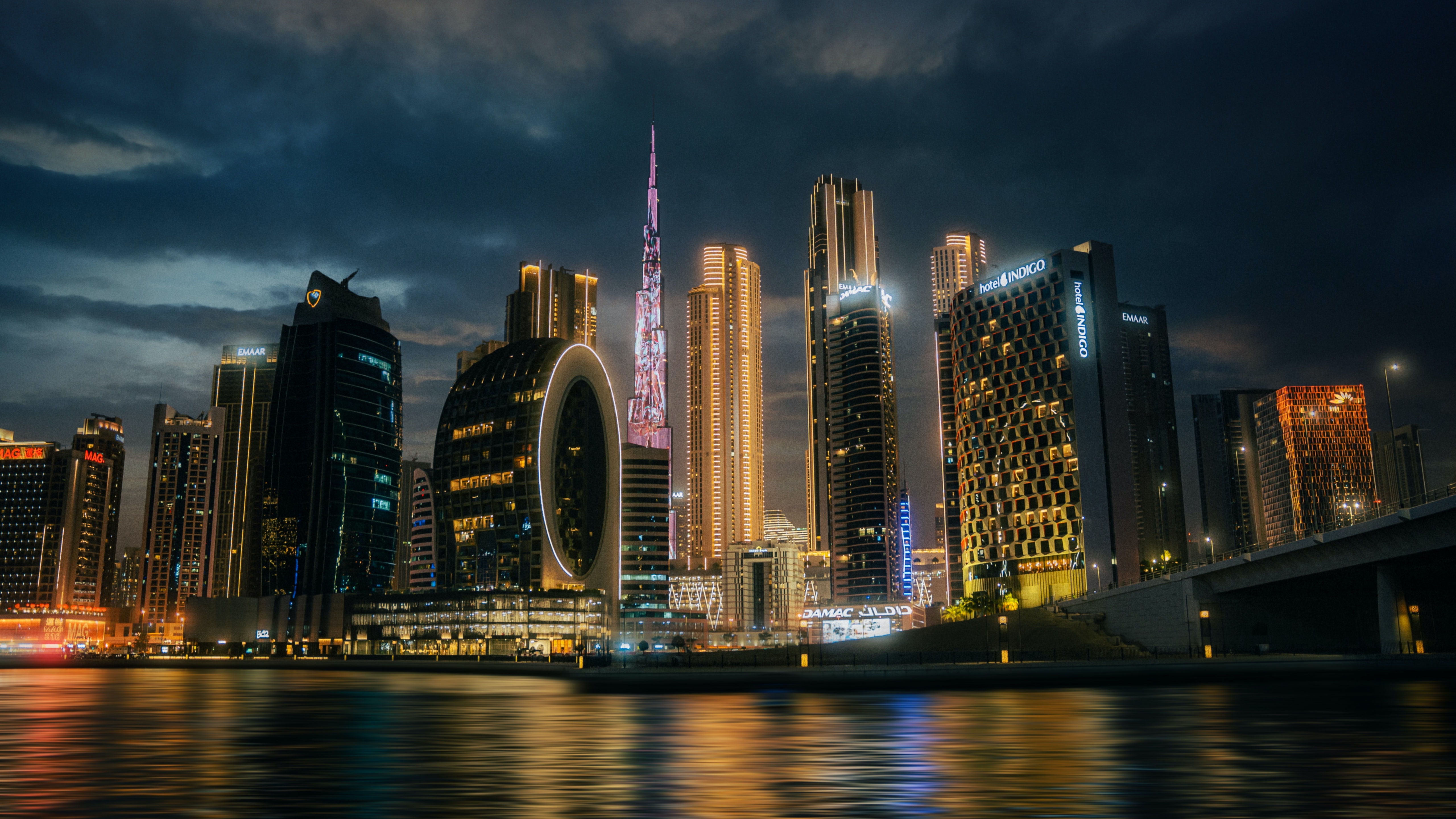 Description: A city skyline with a bridge and a river at night with lights reflecting off the water and buildings in the background.
