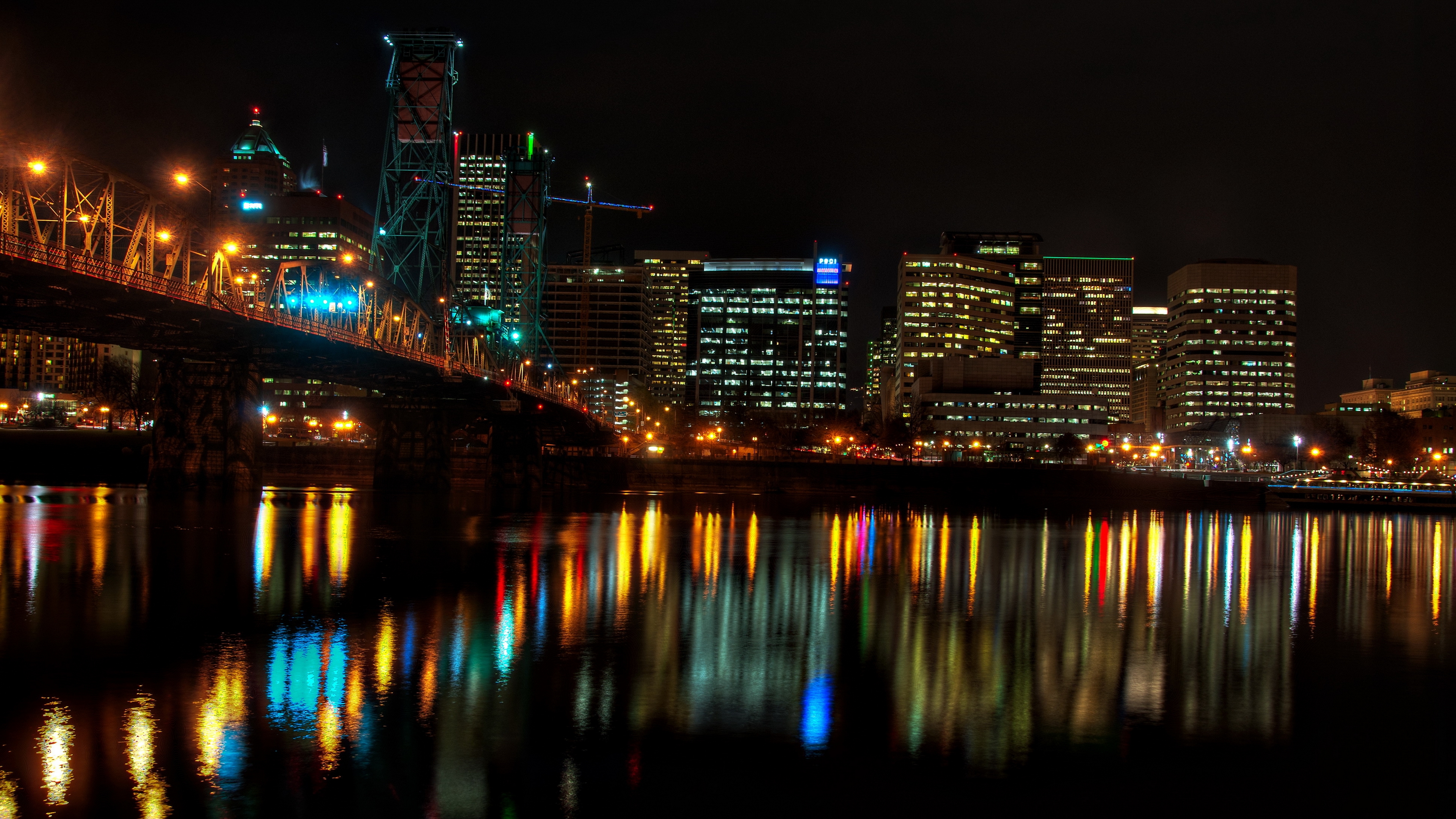 Description: A city skyline with a bridge over a river at night with lights reflecting off the water and buildings in the background.