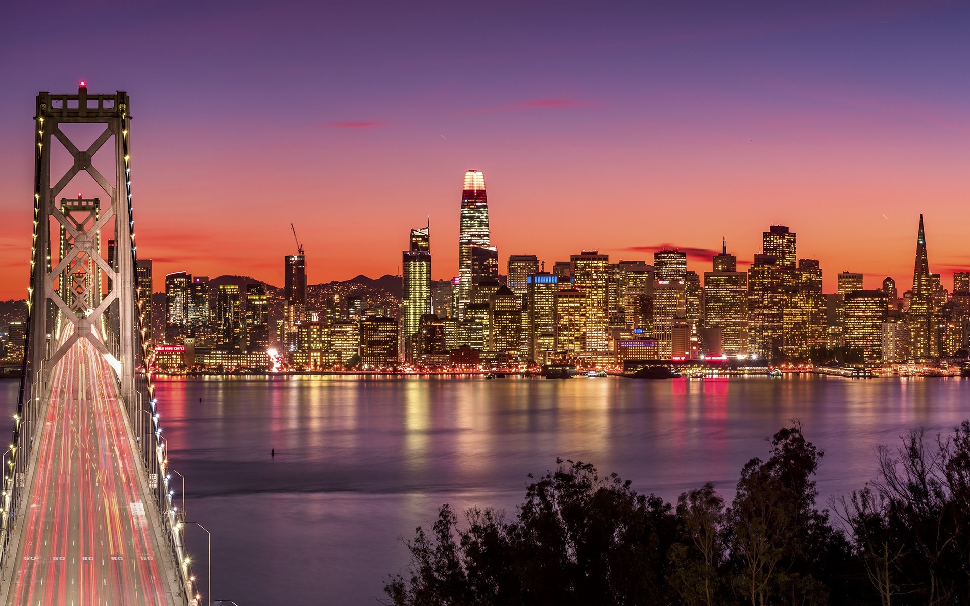Description: A city skyline with a bridge and a river at night with lights on it and a bright orange sky.