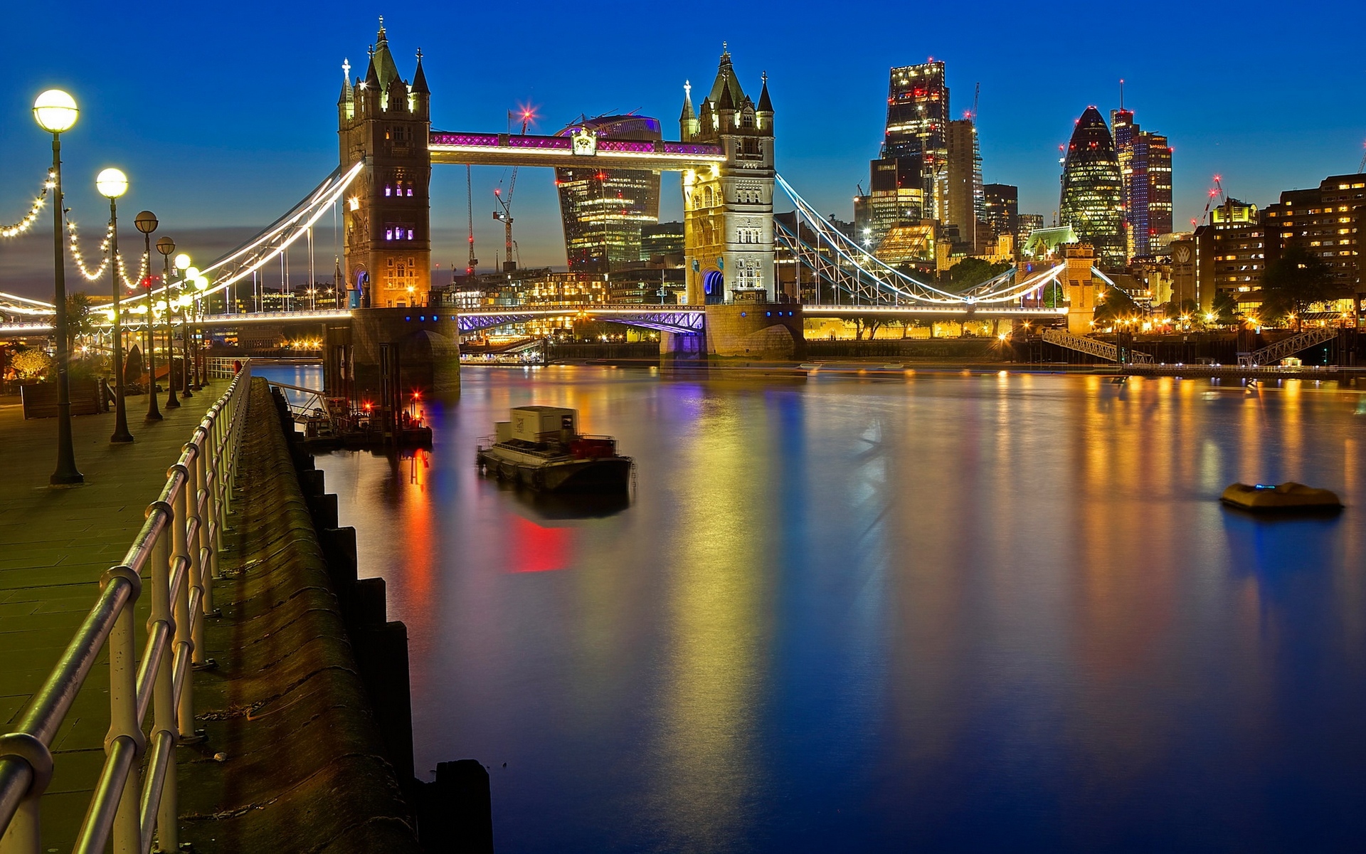 Description: A city skyline with a bridge and a river at night with lights on the buildings and a boat in the water.