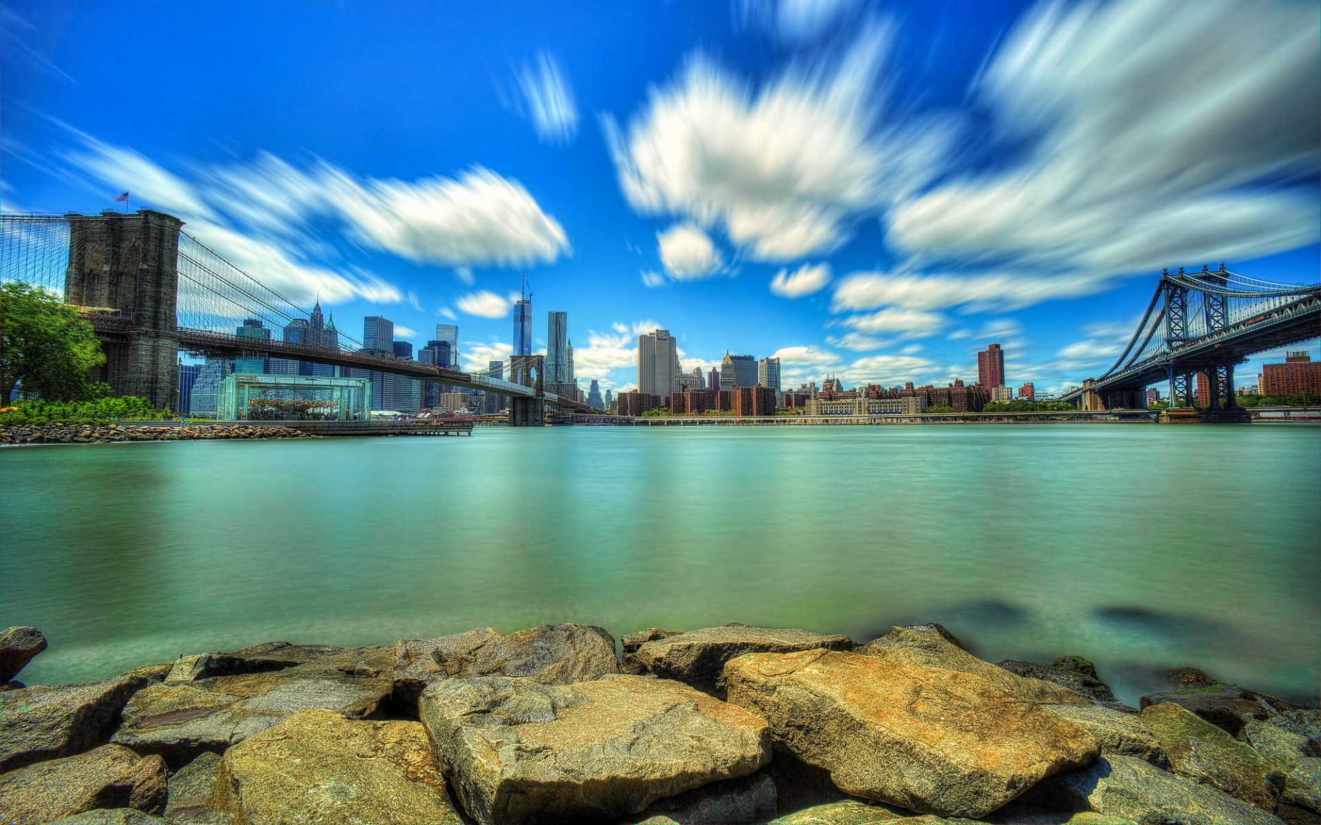 Description: A picture of a city skyline and a bridge over a river with rocks in the foreground and a blue sky with clouds.