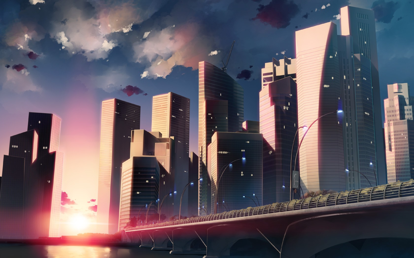 Description: A city skyline with a bridge and a bridge in the foreground and a sunset in the background with clouds.