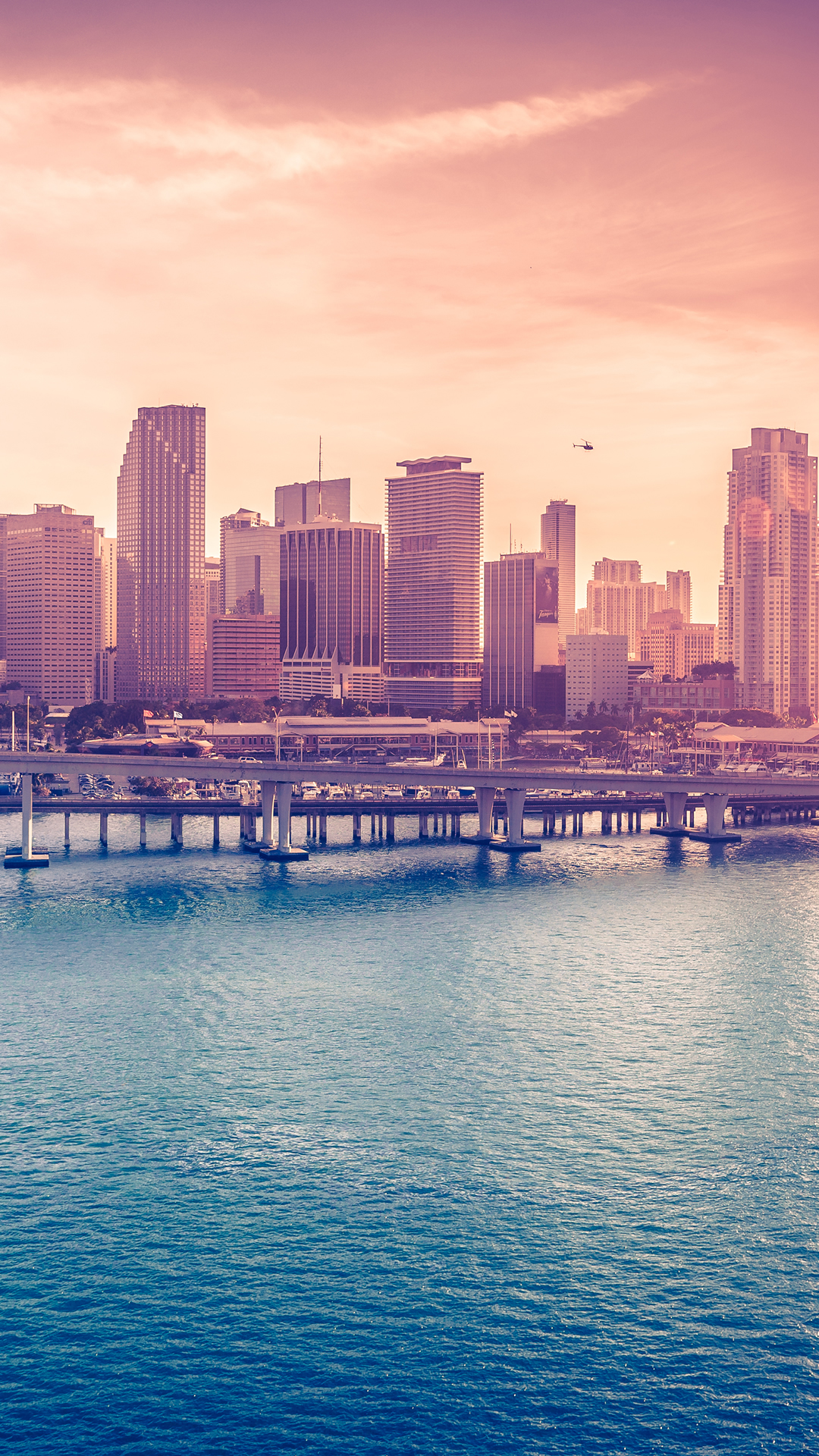 Description: A city skyline with a bridge over the water and a boat in the water below it and a bridge in the foreground.