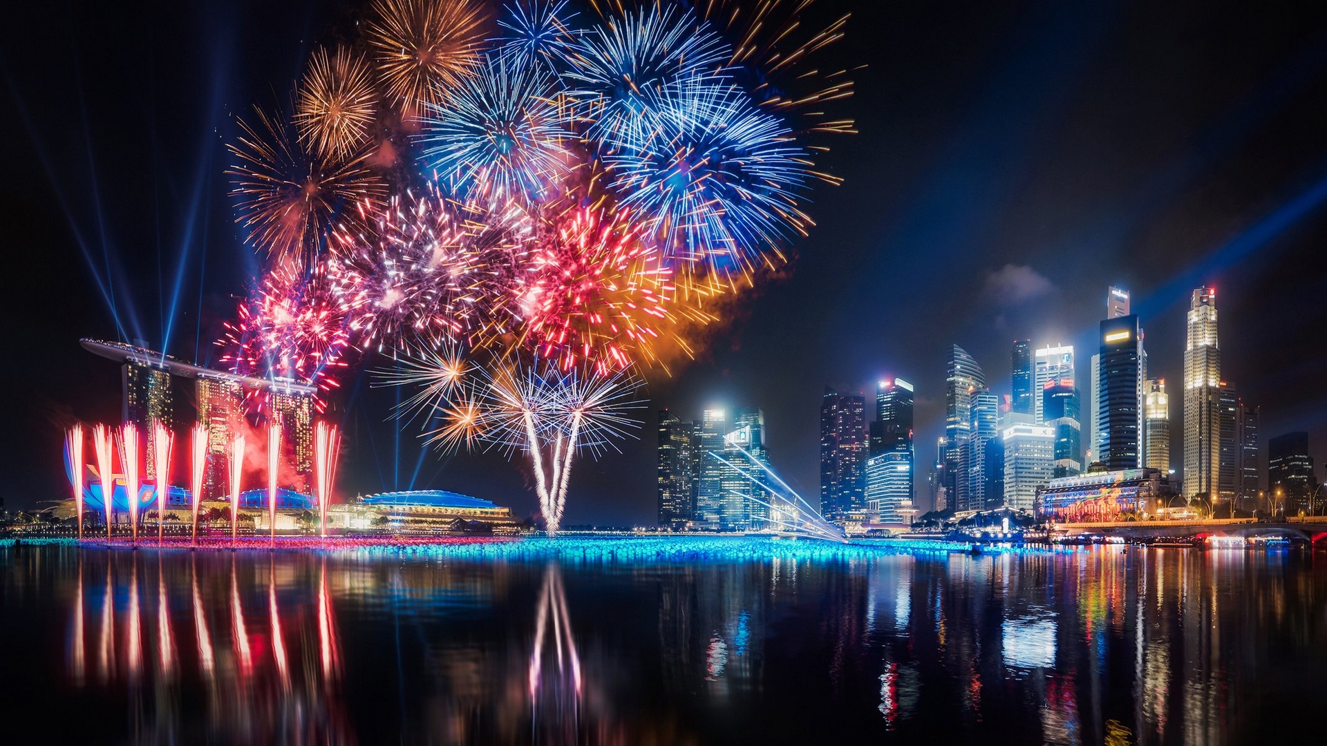 Description: A city skyline with a lot of fireworks in the sky and water at night time with a reflection of the city lights.