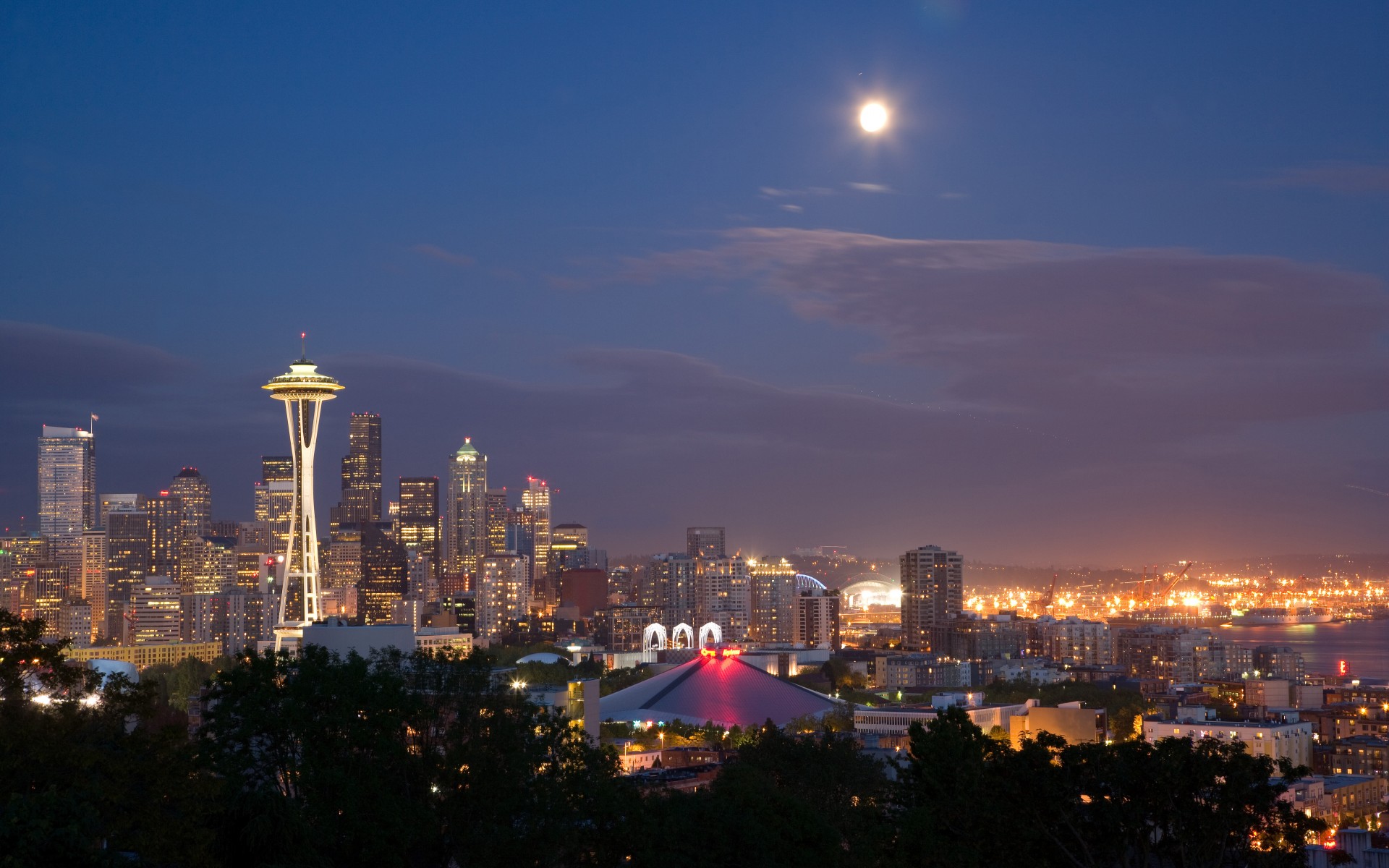 Description: A city skyline with a full moon in the sky and a lit up building in the foreground with a lit up dome.