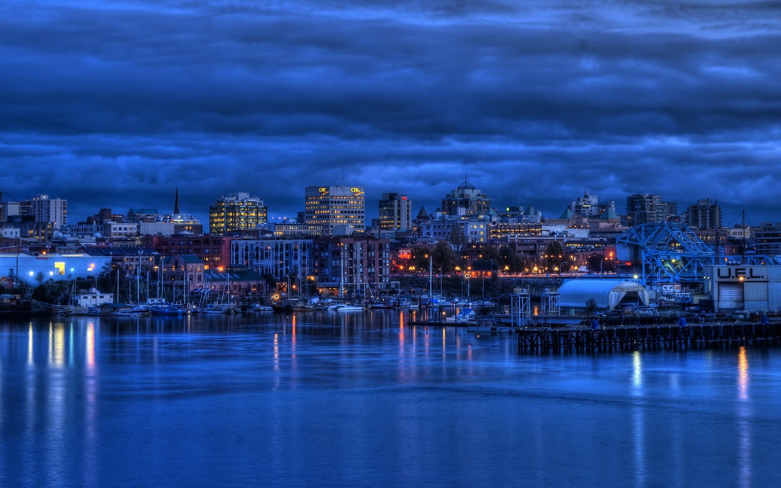 Description: A city skyline with a harbor and a boat in the water at night time with a cloudy sky above.