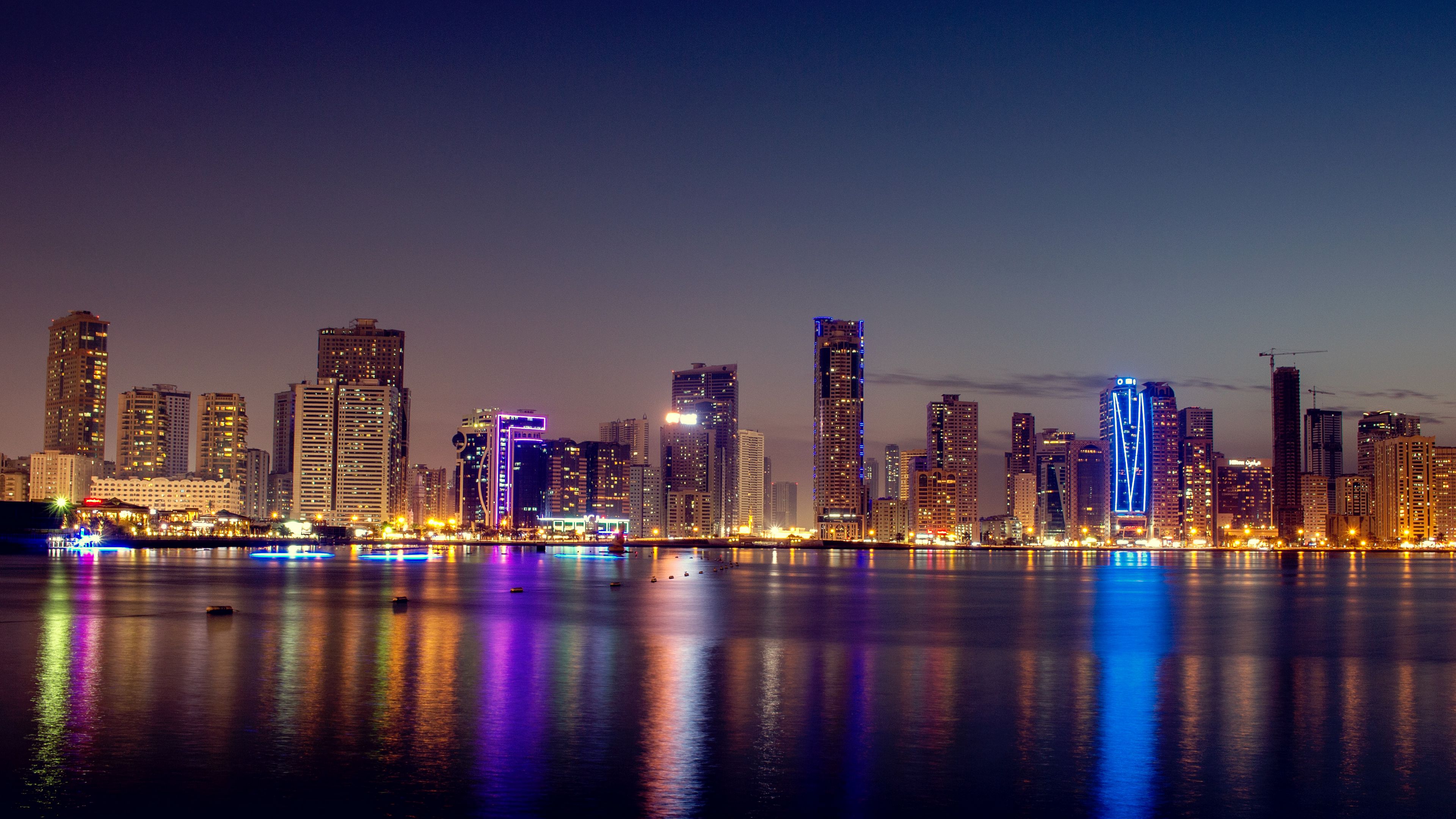 Description: A city skyline with a lake and a boat in the foreground at night time with lights reflecting off the water.
