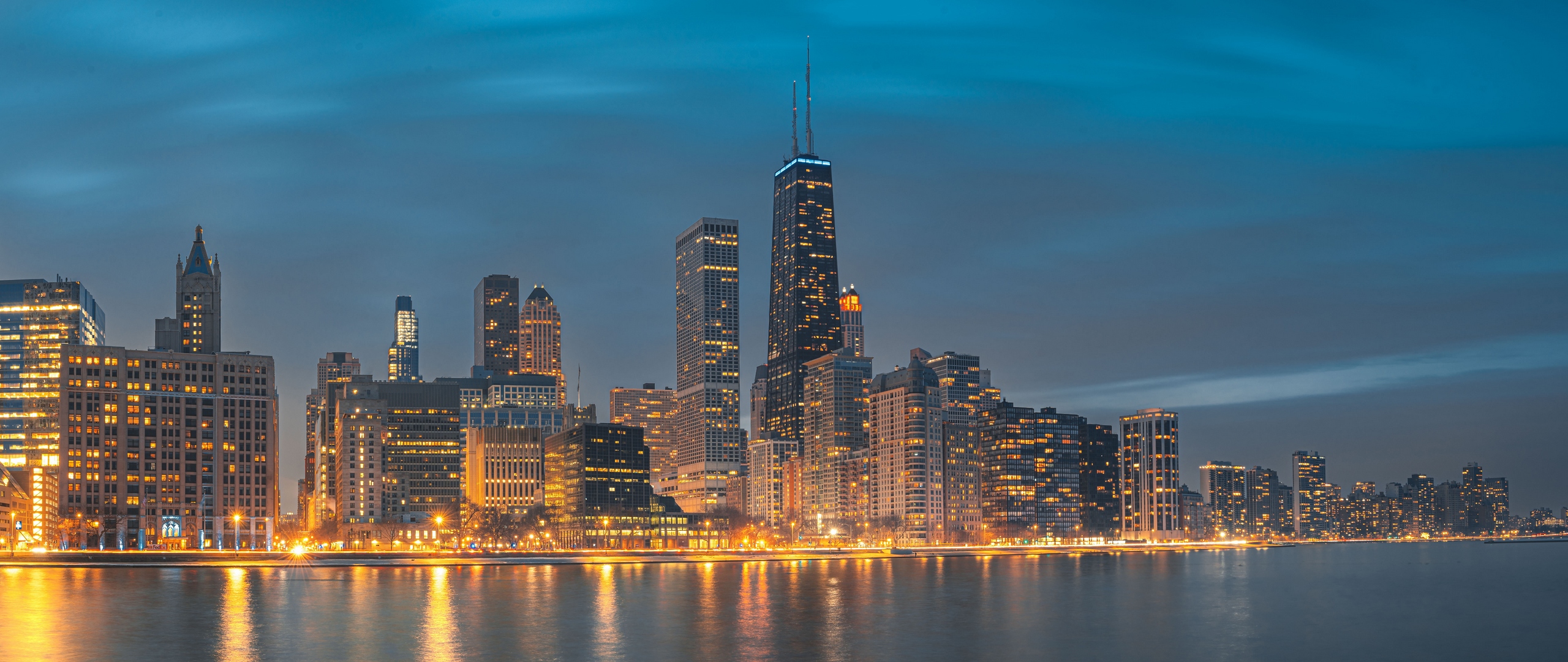 Description: A city skyline at night with a lake in front of it and a sky line in the background with clouds.