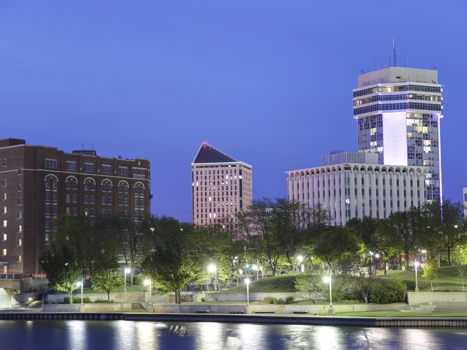 Description: A city skyline with a lake and buildings at night time with lights on the buildings and trees in the foreground.