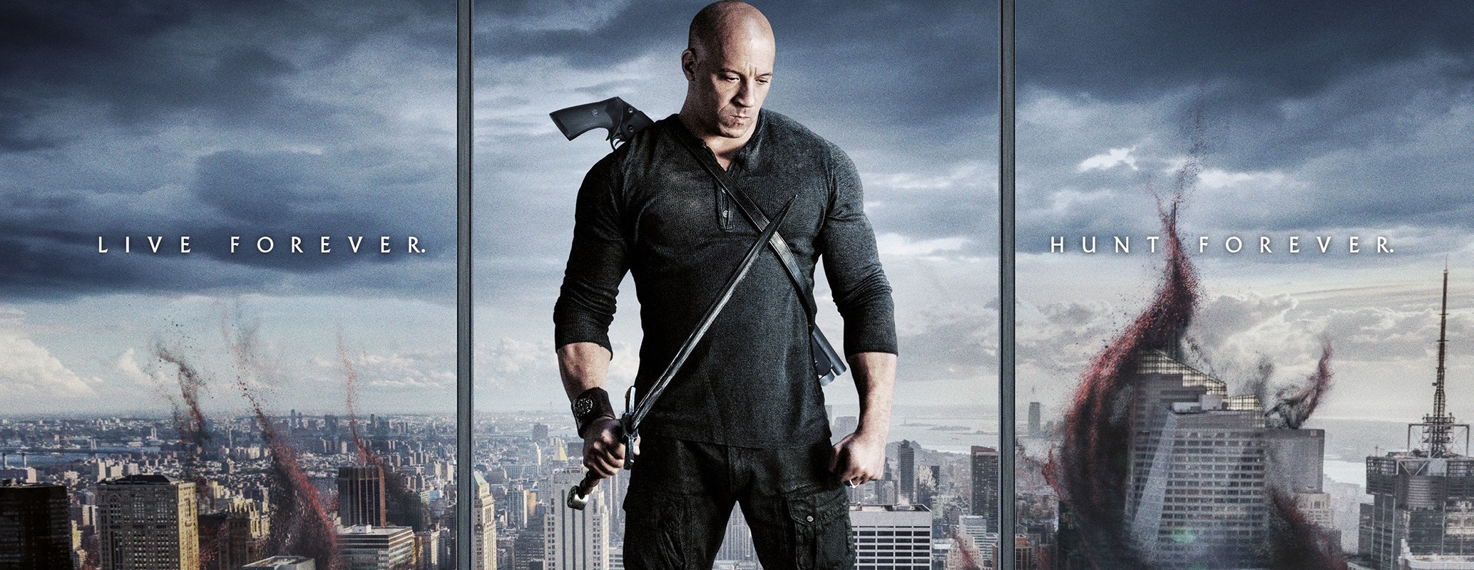 Description: A man holding a knife in front of a city skyline with a sky background and a movie poster in the foreground.